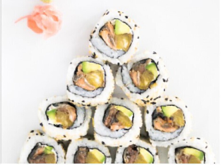Piel de salmón crocante, aguacate, palmito y queso crema, topping de maduro.