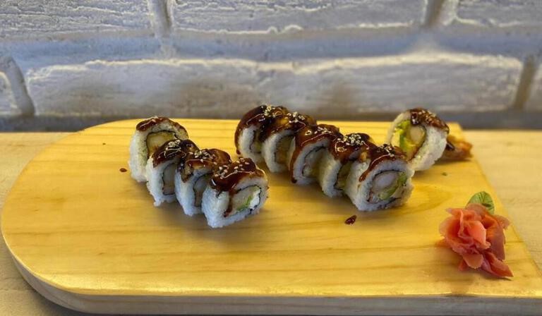 Langostino tempura, queso crema, aguacate, por fuera, topping de anguila horneada, con salsa teriyaki y ajonjolí.