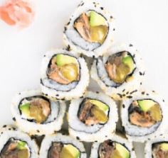 Langostino tempura, queso crema, aguacate, por fuera, topping de atún y salmón.