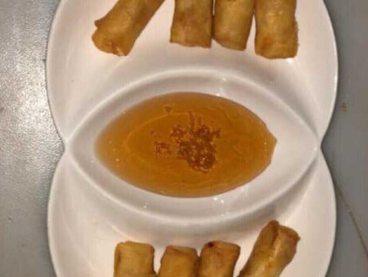 Palmito tempura, queso crema, pepino, maduro y por fuera, mayonesa y cebolla puerro.