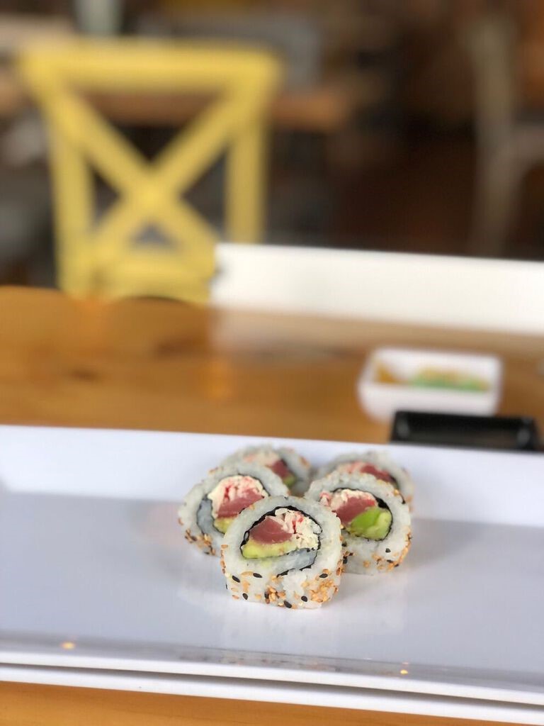 Kanikama, atún, aguacate, queso crema y como topping mix de ajonjolí.