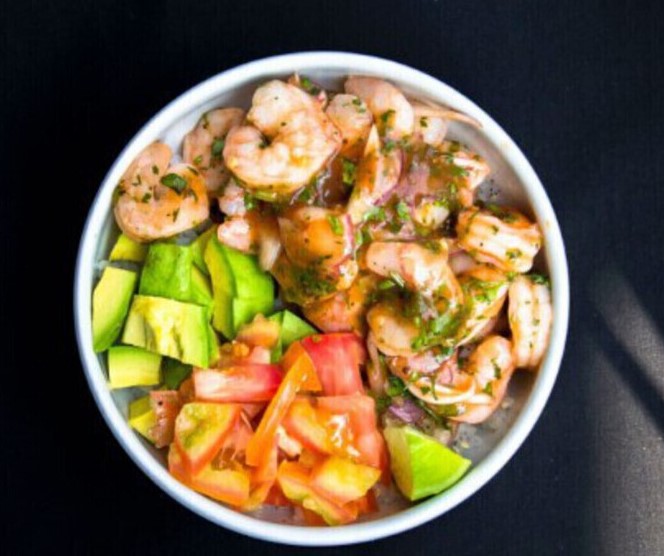 Ceviche de camarones, aguacate, lechuga, tomate.