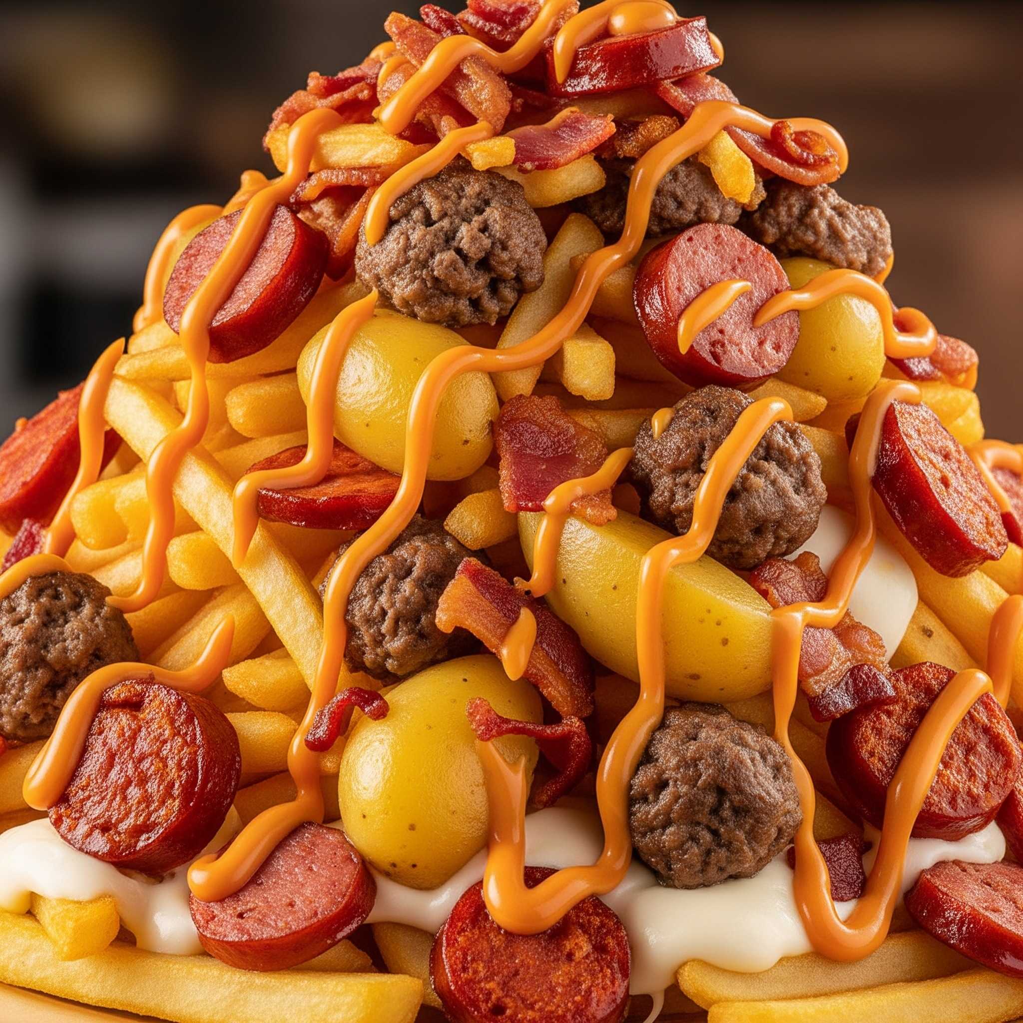 Papa francesa, papa amarilla, salchicha, tocineta, chorizo, ripio de papa, queso y salsas.