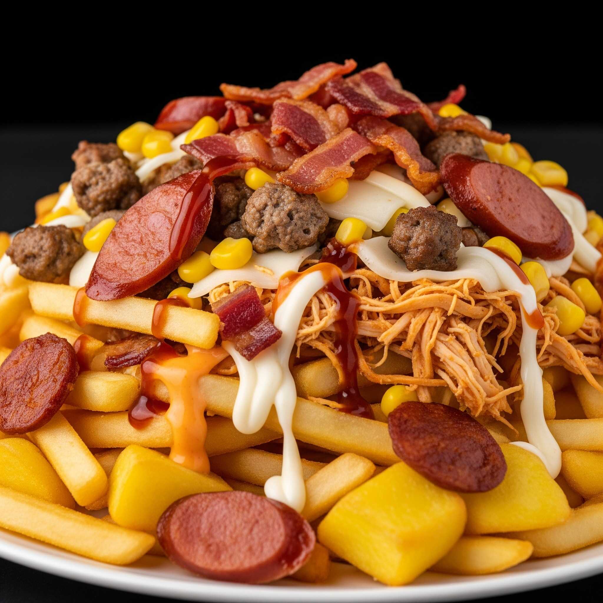 Papa francesa, papa amarilla, ripio de papa, salchicha, tocineta, chorizo, carne de hamburguesa, pollo desmechado, maíz, queso y salsas.