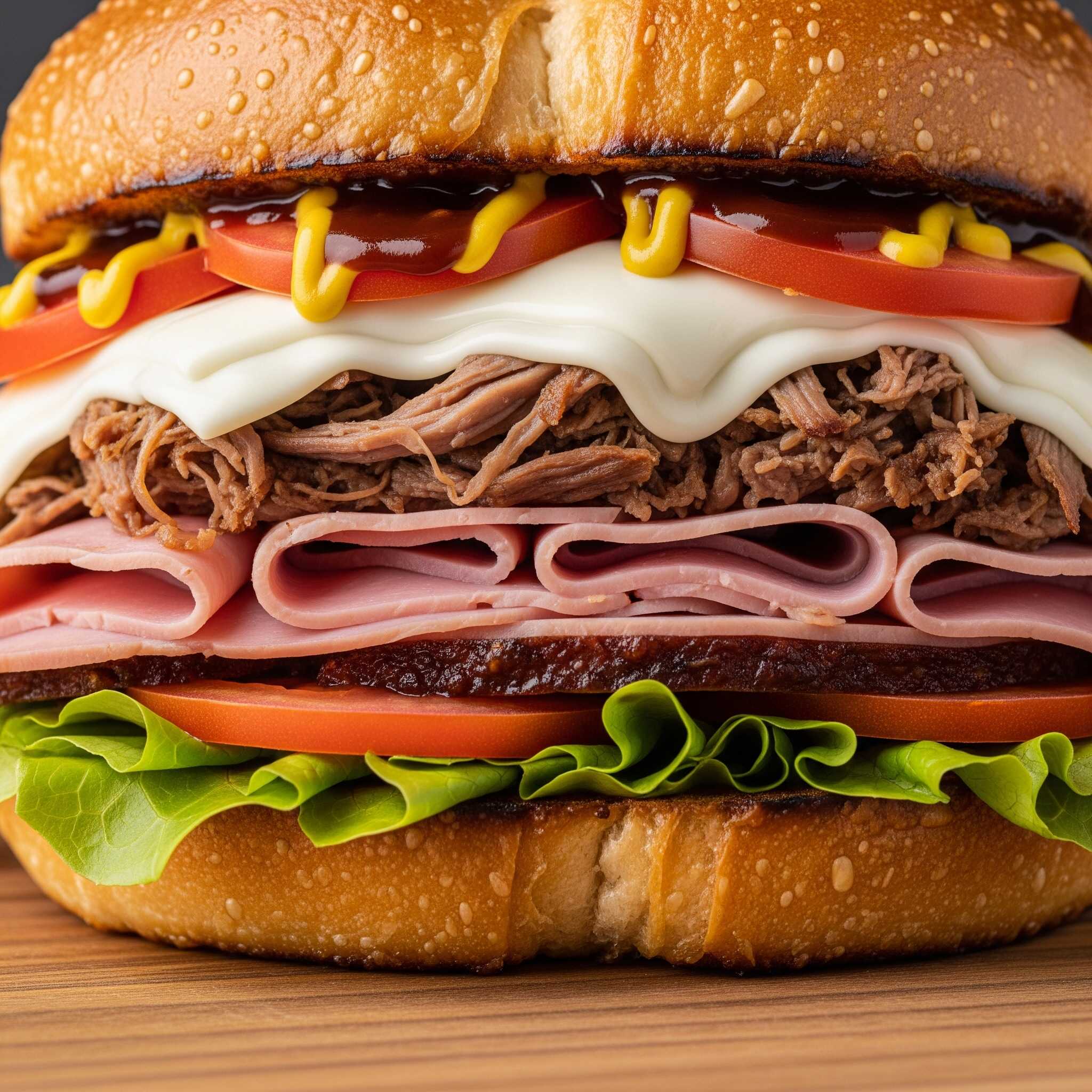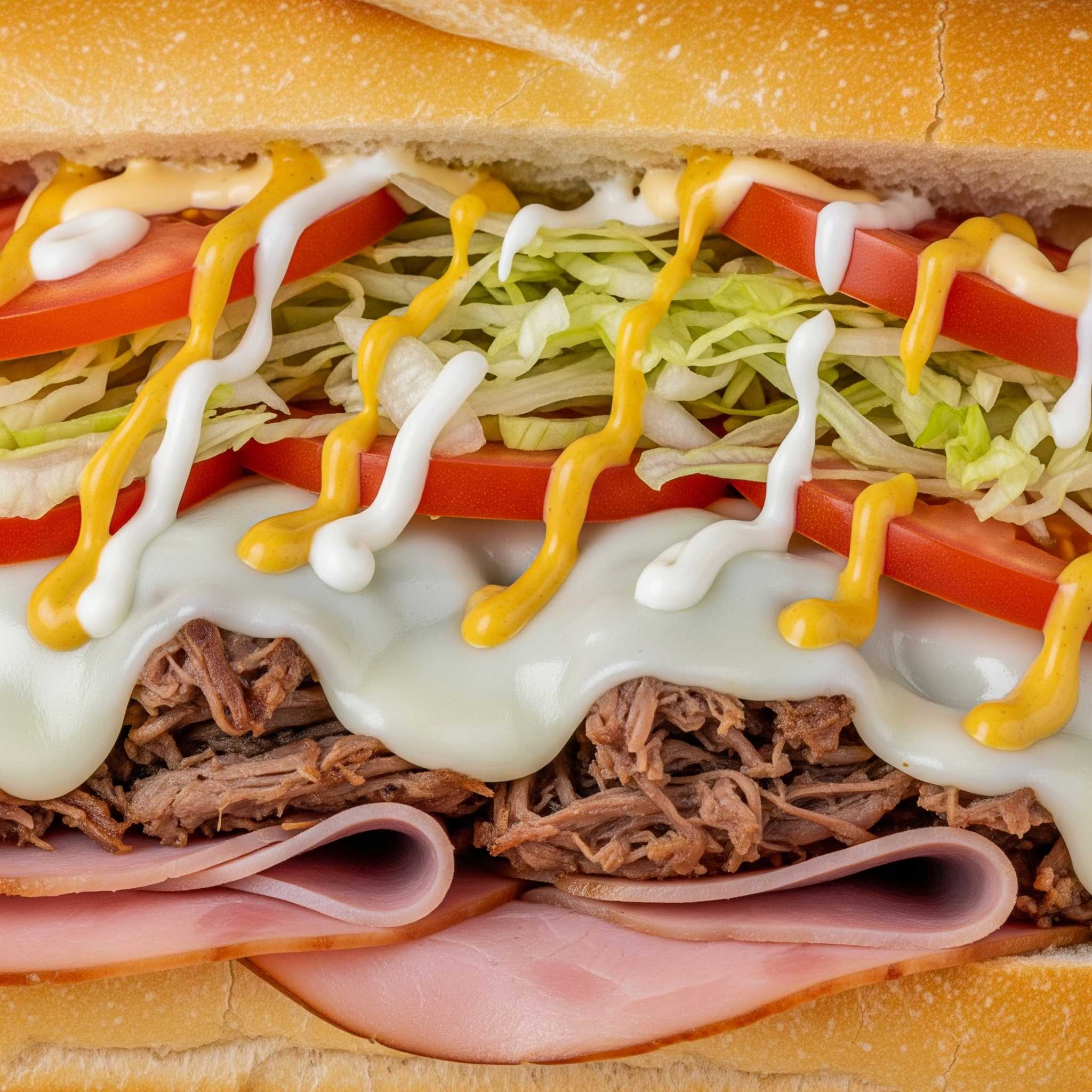 Jamón, carne, queso, tomate, lechuga, salsas y porción de papas.