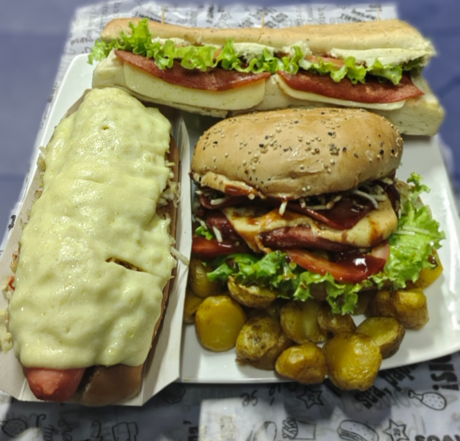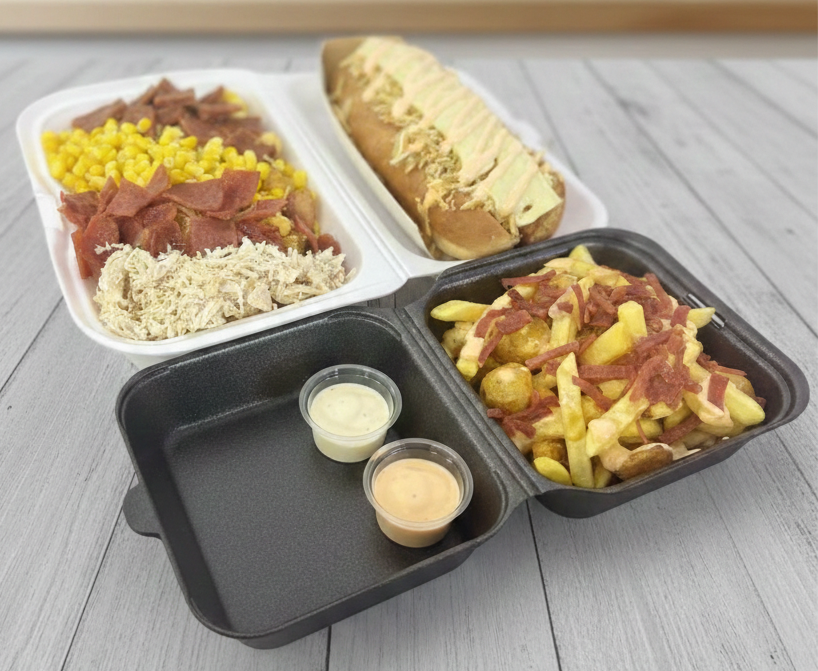Salchipapa (papa amarilla, papa francesa, salchicha, tocineta, chorizo, pollo desmechado, carne hamburguesa, maíz, queso y salsas) + Perro Especial (salchicha, tocineta, queso, ripio, salsa cheddar) + Papas Baicon