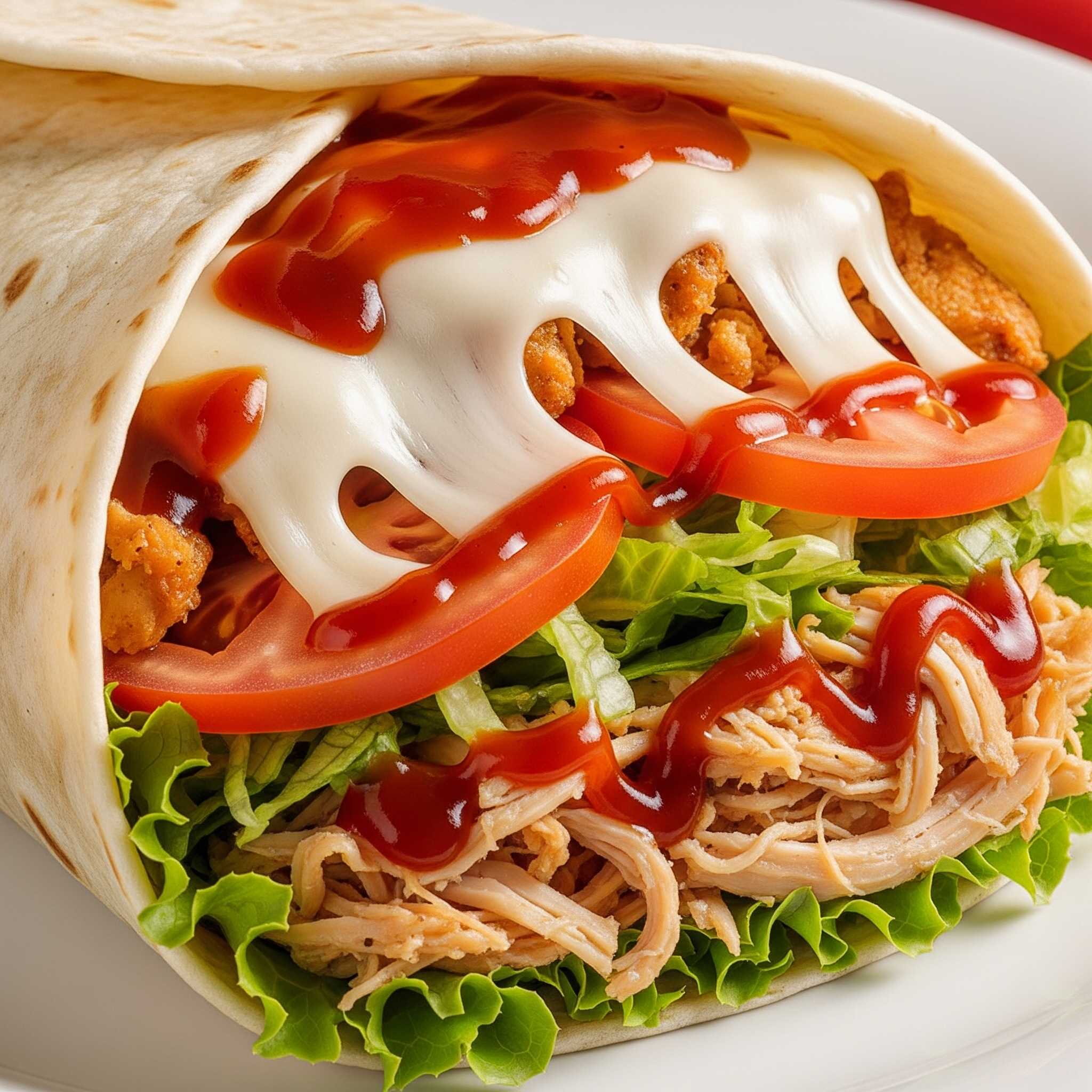 Pollo, lechuga, tomate, salsas, ripio de papa y porción de papa.