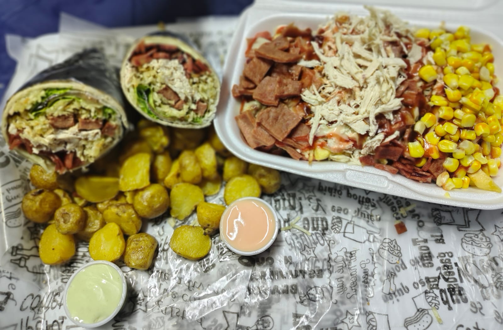 1 Salchipapa especial (Papa amarilla, papa a la francesa, salchicha, tocineta, chorizo, maíz, pollo desmechado, queso, ripio y salsa), 1 wrap especial (maiz, pollo, queso, tomate, lechuga y salsa) y 1 hamburguesa especial. (carne, jamón, tocineta, ripio de papa, queso y salsas)