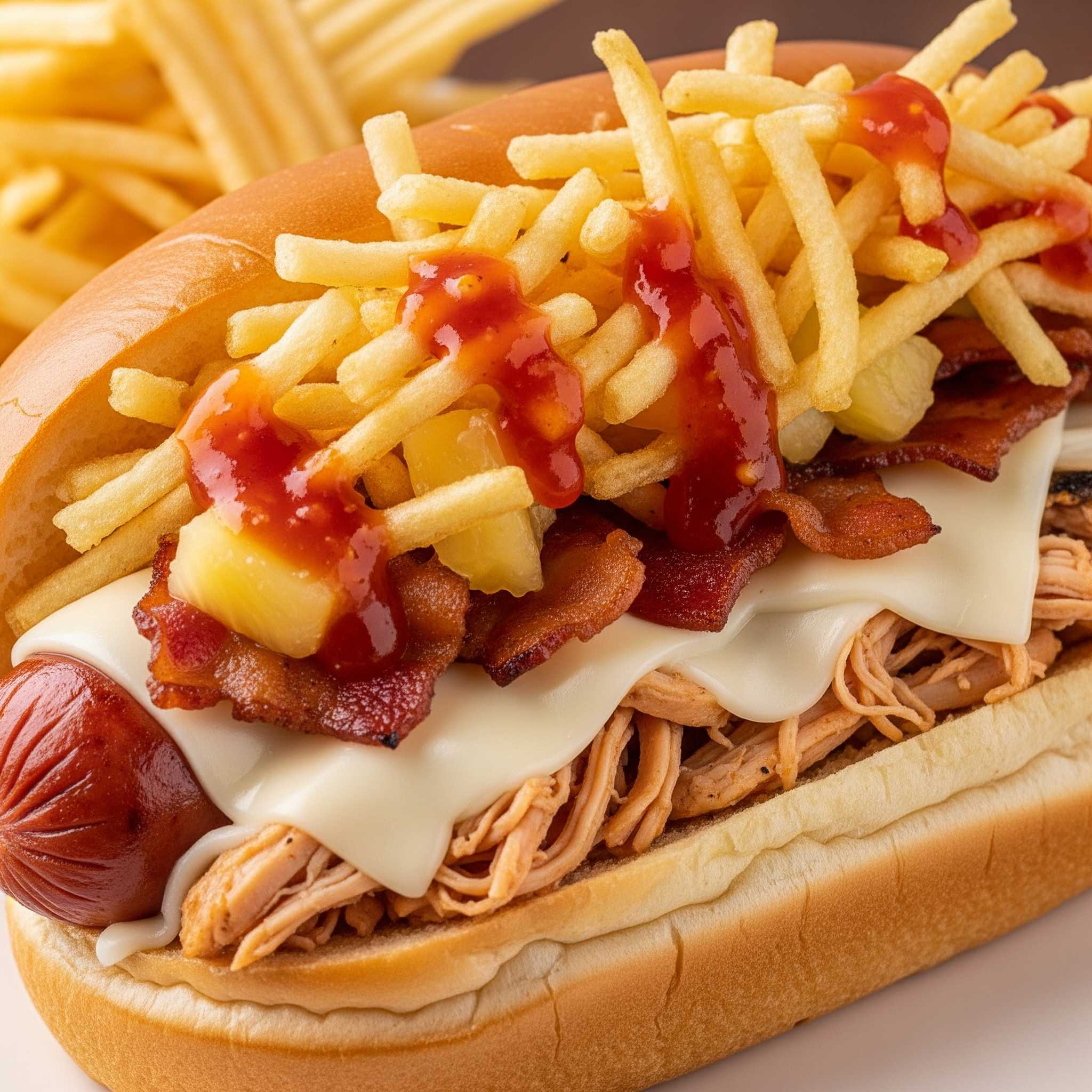 Pan brioche, salchicha americana, tocineta, pollo desmechado, queso, cebolla caramelizada, salsas y porción de papas.