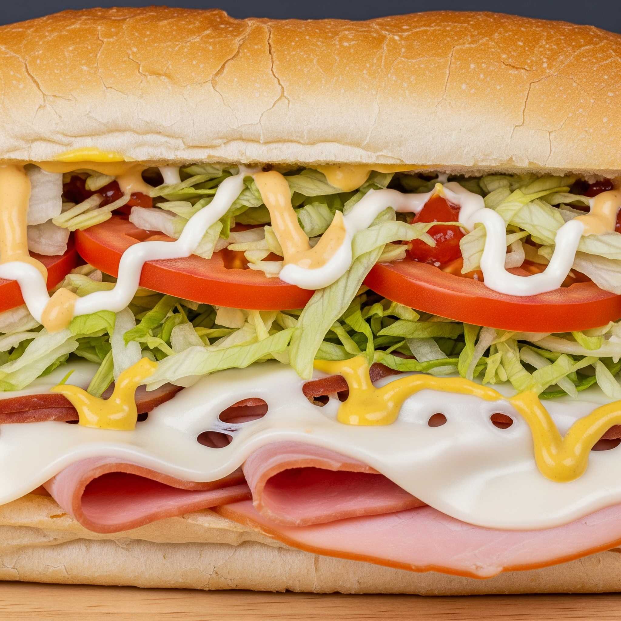 Jamón, queso, lechuga, tomate, salsas y porción de papa.