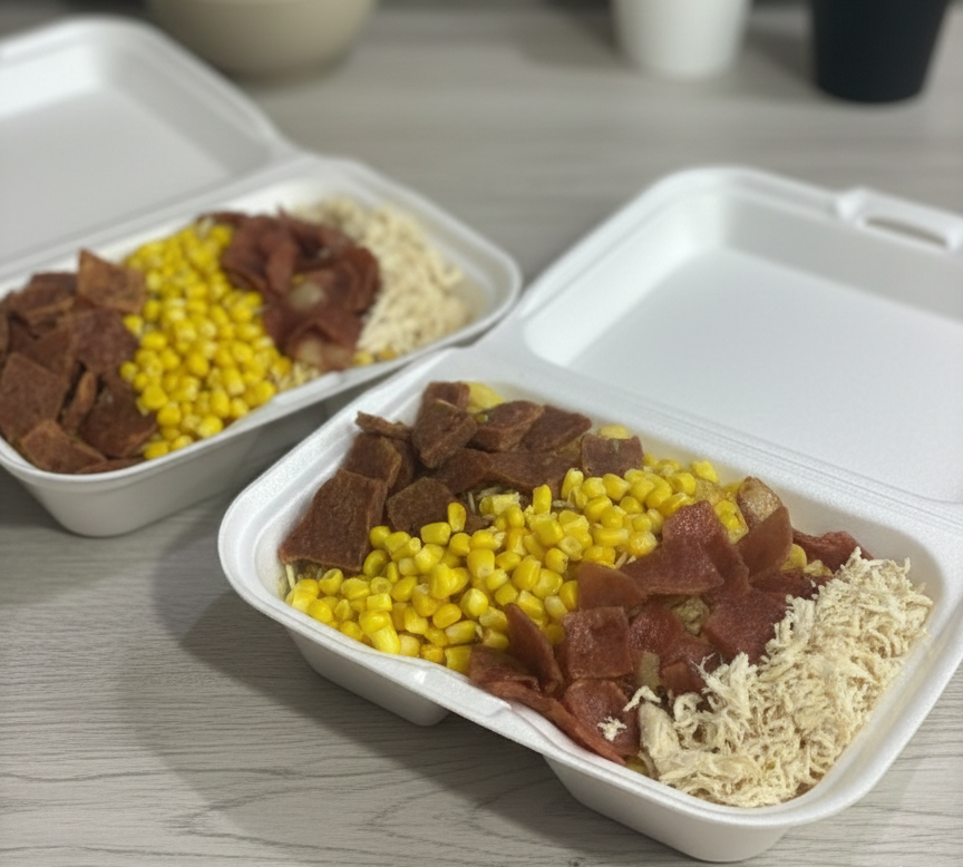 Pollo, carne, lechuga, maíz, tomate, queso, salsas, ripio de papa y porción de papa.
