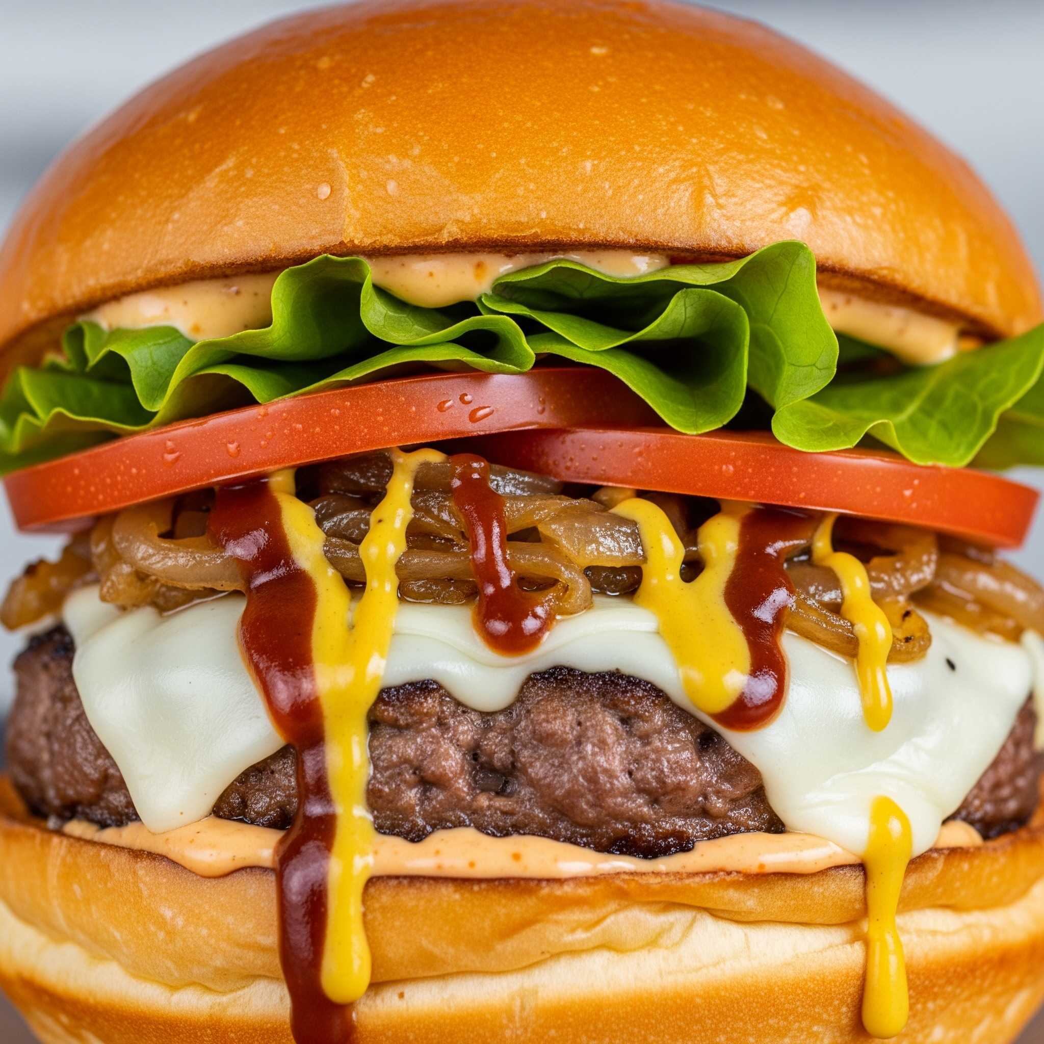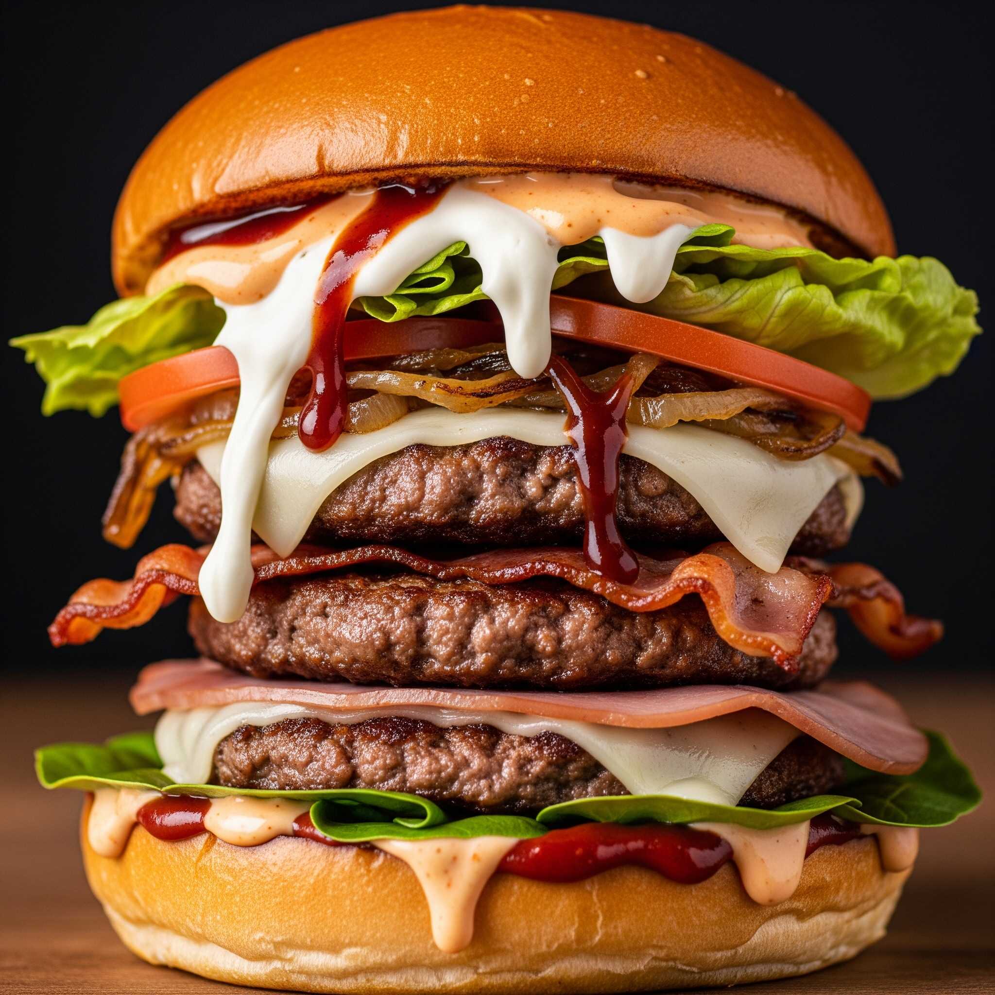 Pan brioche, 3 carnes de 100 g, tocineta, jamón, cebolla caramelizada, ripio de papa, tomate, lechuga, queso, salsas y porción de papa.