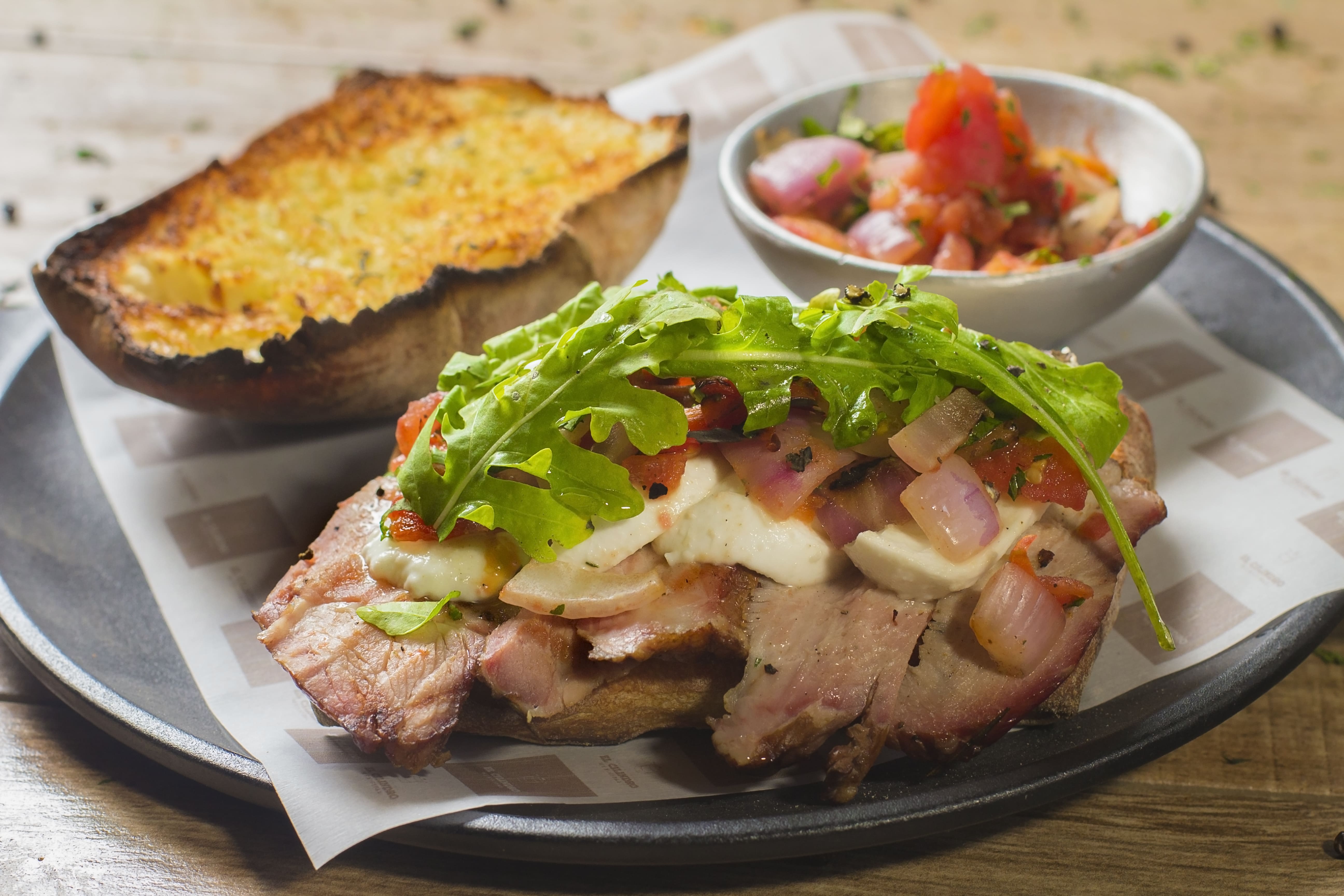 Pan ciabatta, bondiola de cerdo, rúgula, verduras rústicas y queso mozzarella de búfala.