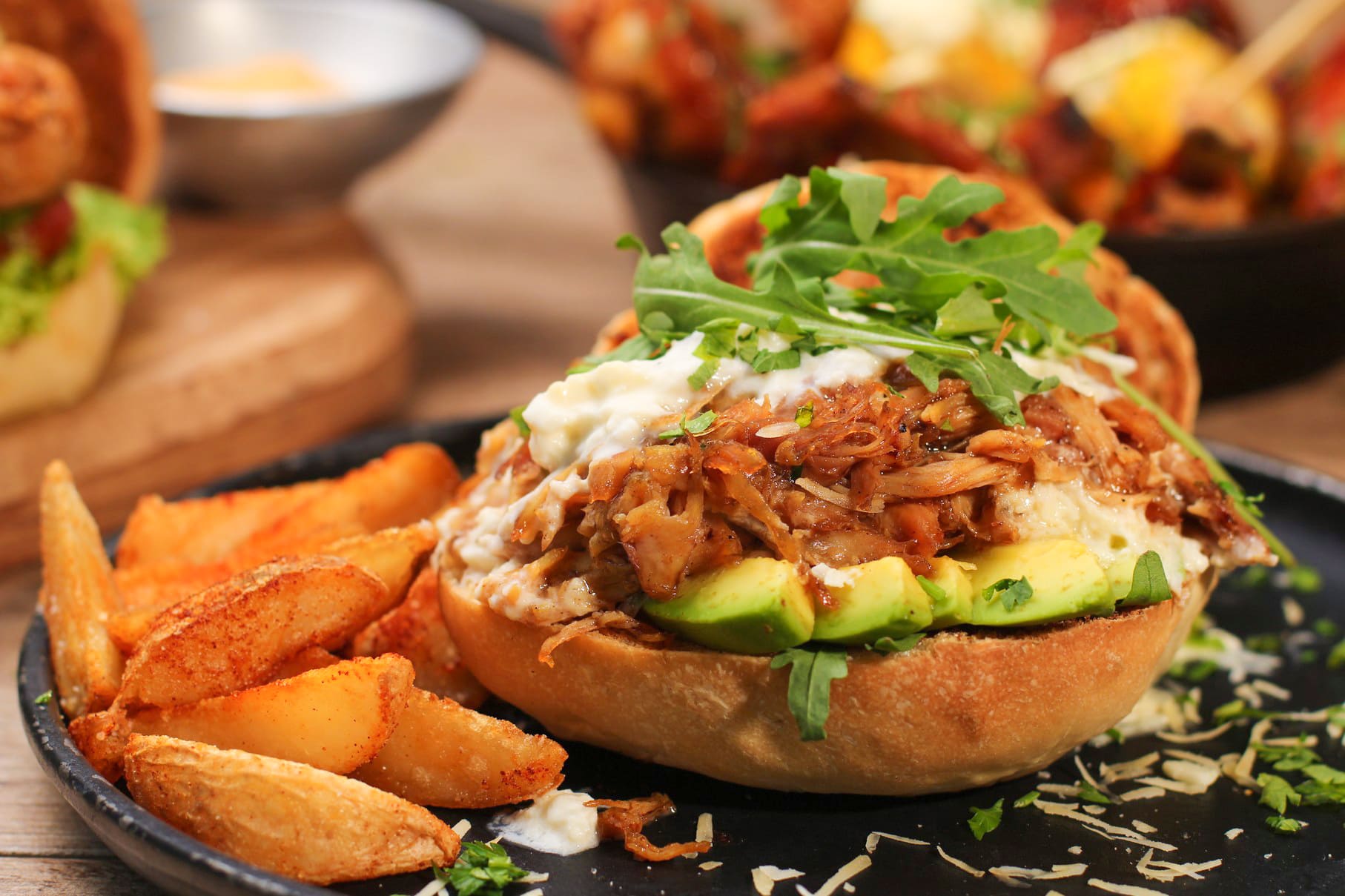 Pan ciabatta, pollo desmechado al cilindro, aderezo de Pulled Pork, aguacate, rúgula y salsa BBQ.