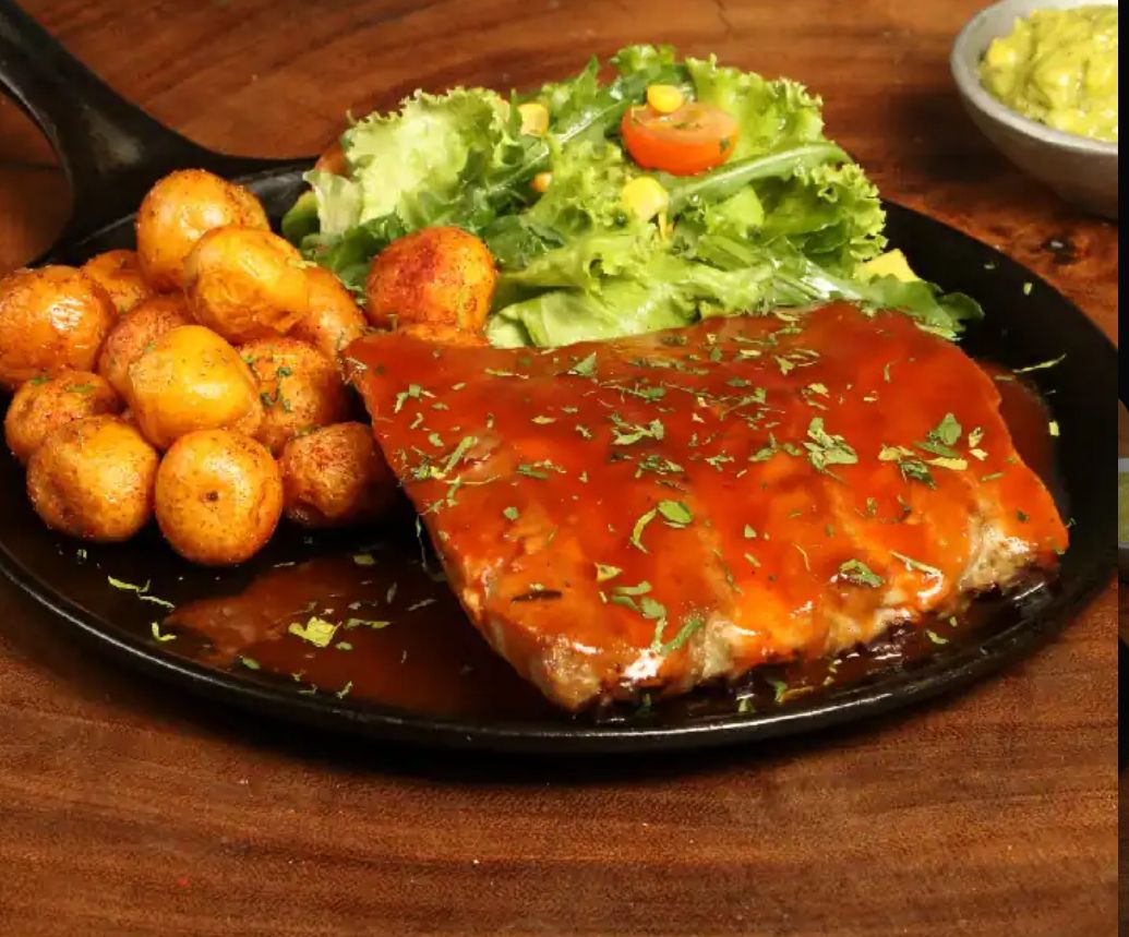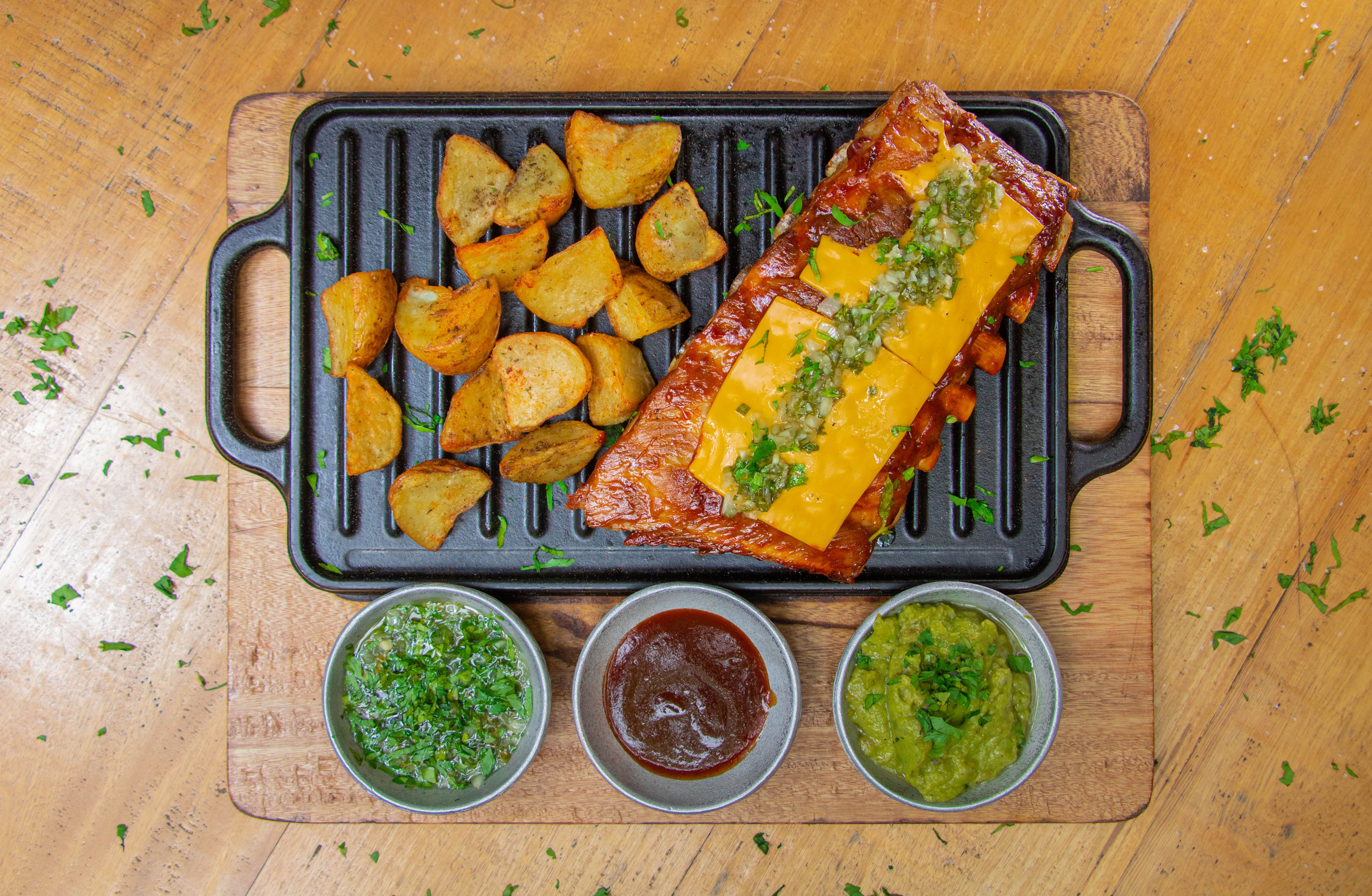 Pork ribs St. Louis, horneadas y ahumadas artesanalmente en cocción lenta, bañada en salsa BBQ chimichurri de la casa, gratinada con queso americano. Acompañada de papa en cascos.