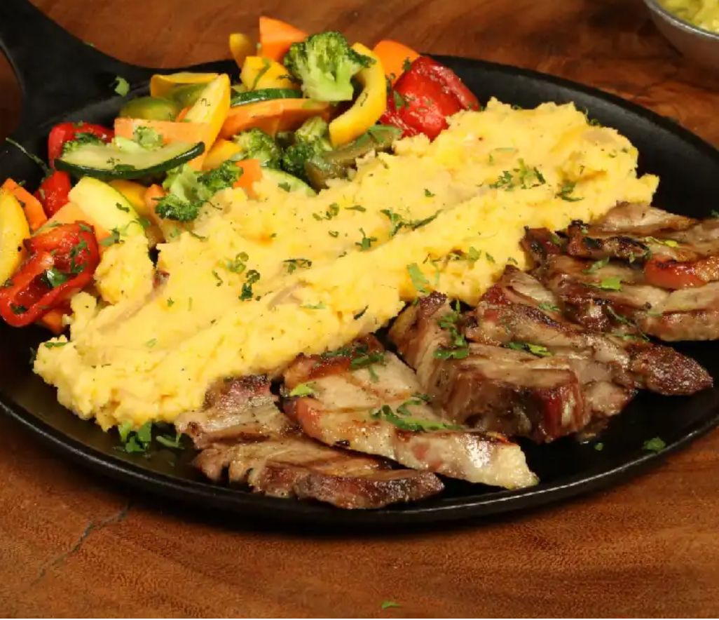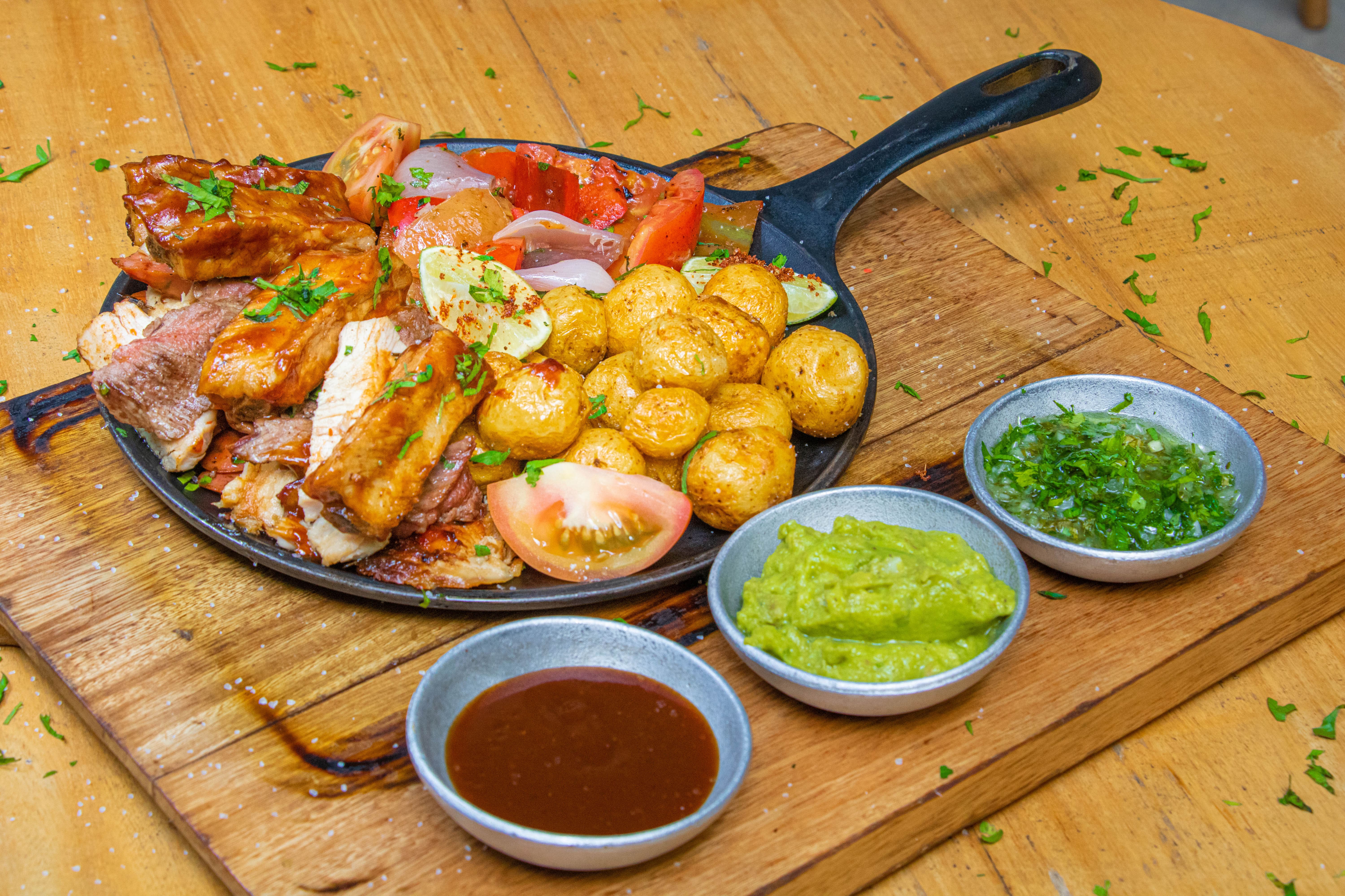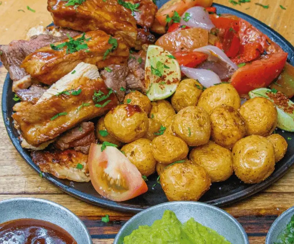 Costilla de cerdo al cilindro, lomo fino a la parrilla pechuga de pollo a la leña, chorizo artesanal verduras rústicas, papa criolla, guacamole chimichurri municipal y salsa BBQ (Sugerido para 2 personas).