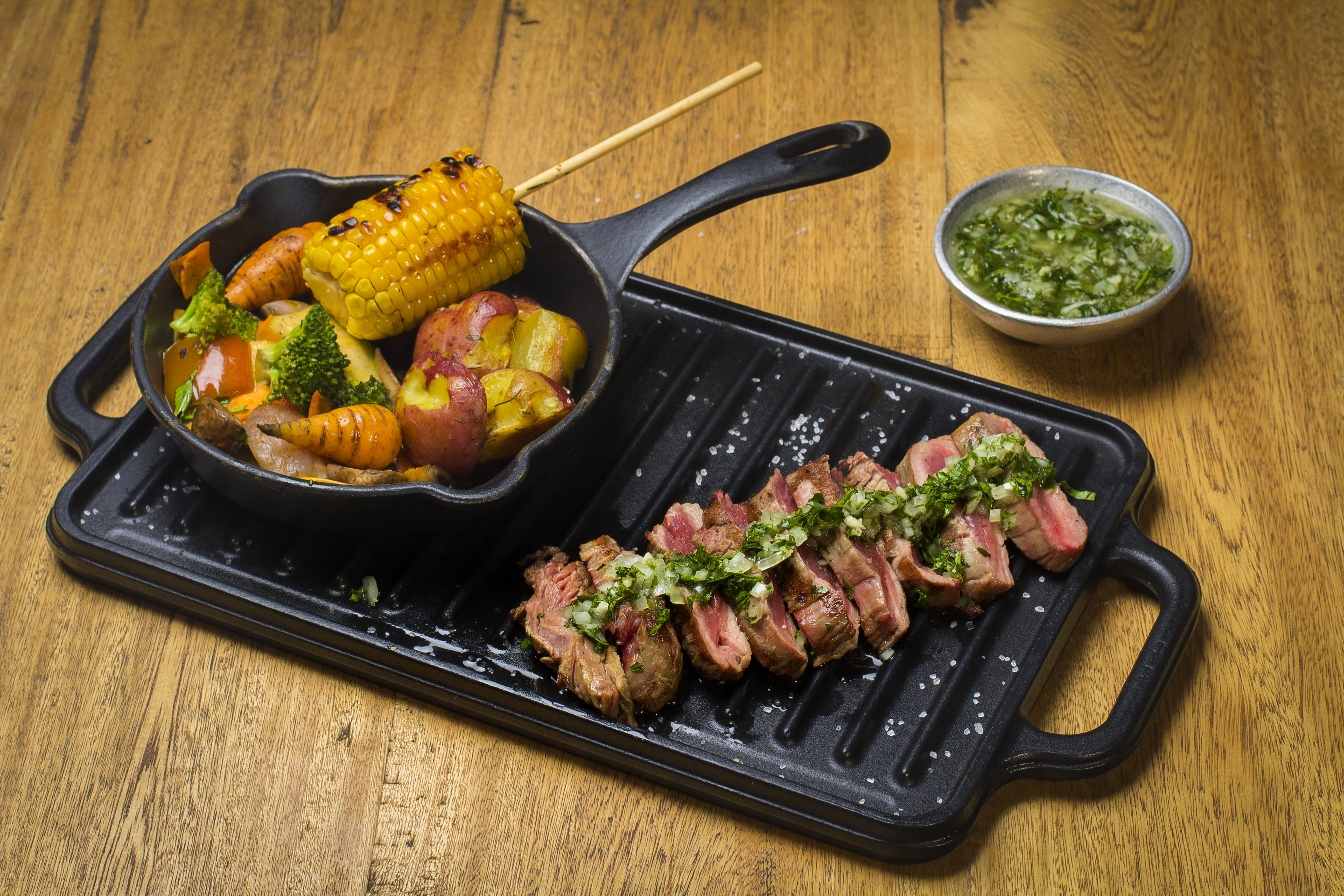 De origen, cortes de lomo fino de res a la parrilla, papa en cascos, maíz dulce, chimichurri y verduras al fuego (Champiñón, pimentón, calabacín, tomate, zanahoria y brócoli).