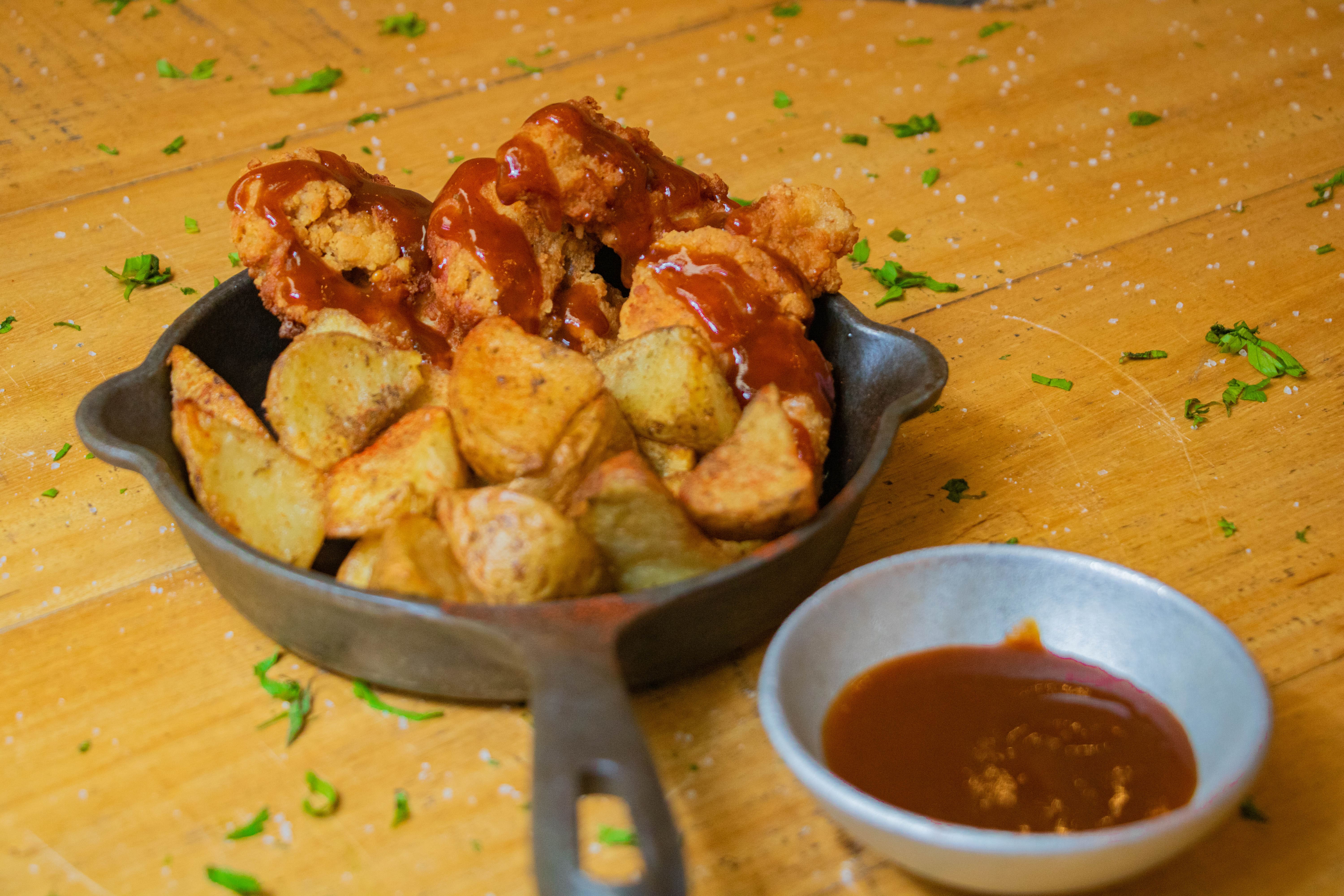 Papa en cascos, pernil de pollo desmechado, plátano maduro en cubos, maíz tierno, salsa BBQ y guacamole.