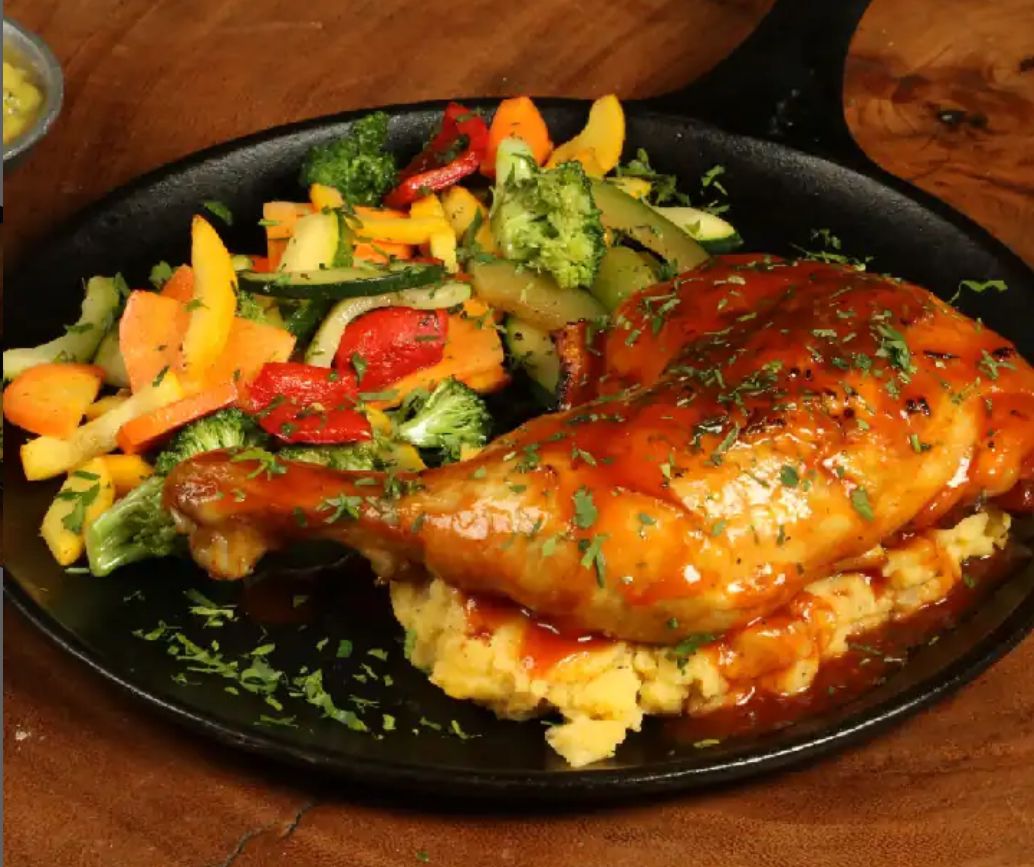 Pollo al cilindro, bañado en salsa BBQ, sobre una cama de puré de papa 100% artesanal (cebolla caramelizada y tocineta crispy) verduras al fuego (brocoli, calabacín, champiñón, zanahoria baby, pimentón). acompañado de chimichurry y salsa BBQ.