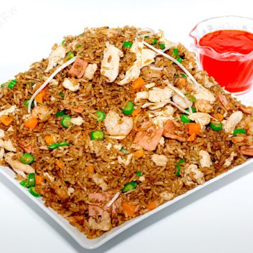 Arroz chino con pollo, camarón, jamón y cerdo.