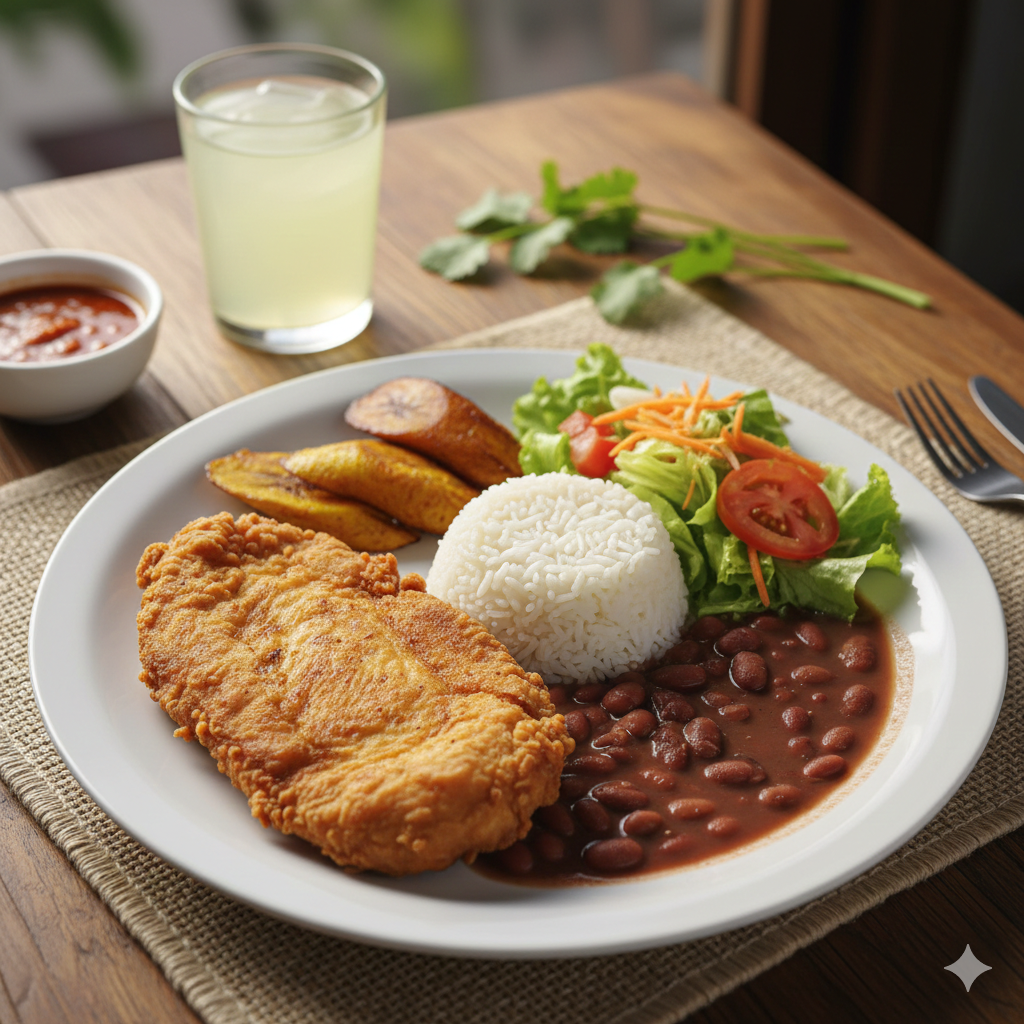 delicioso almuerzo del dia acompañado de arroz, ensalada, tajada madura