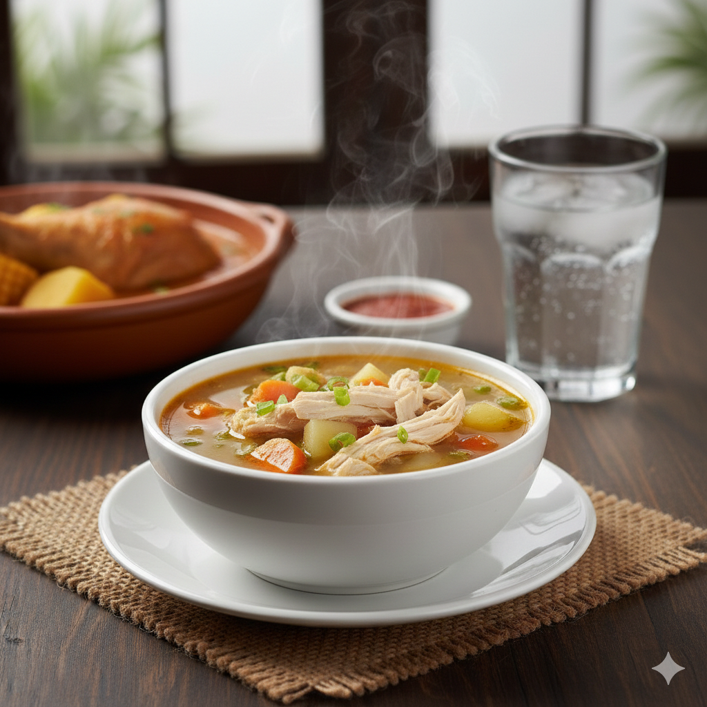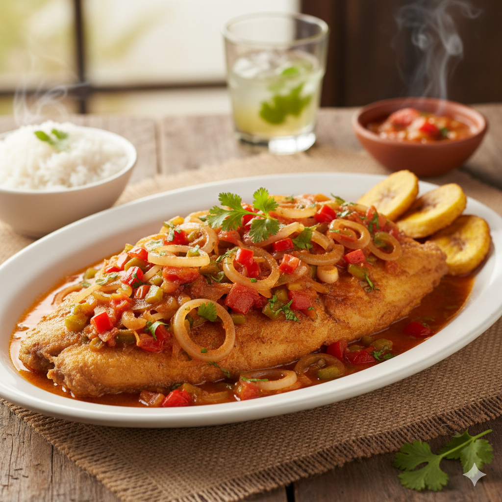 Bagre en salsa criolla acompañado de arroz, ensalada del día, principio a elección, sopa del día y tostadas de plátano.