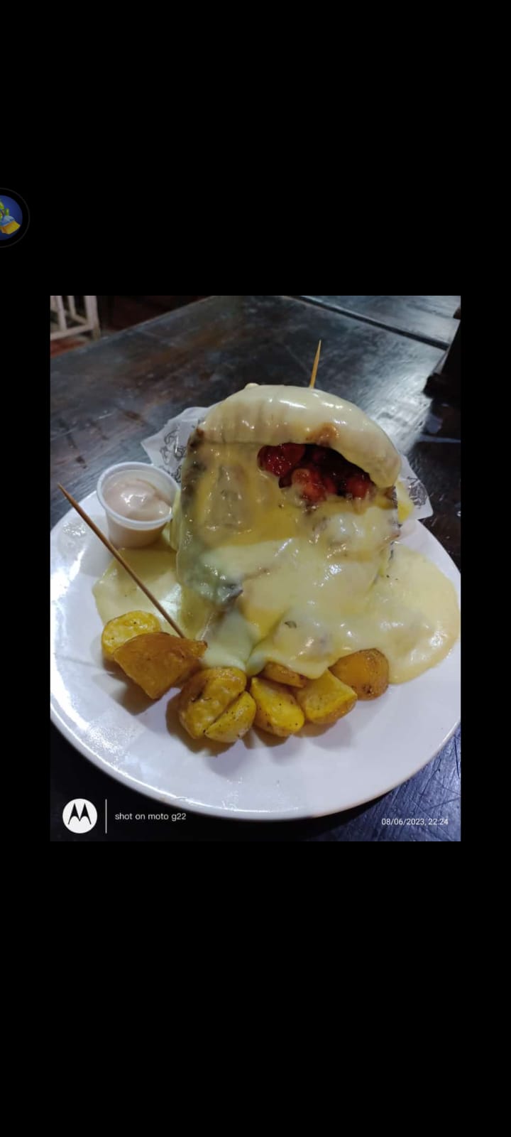 Lechuga, tomate, carne o pollo, cebolla caramelizada, tocineta, queso y salsa de la casa.