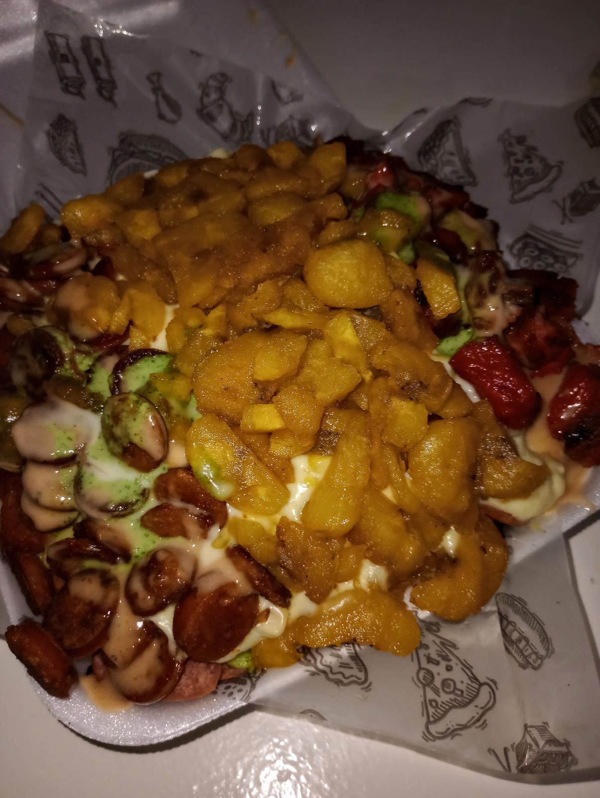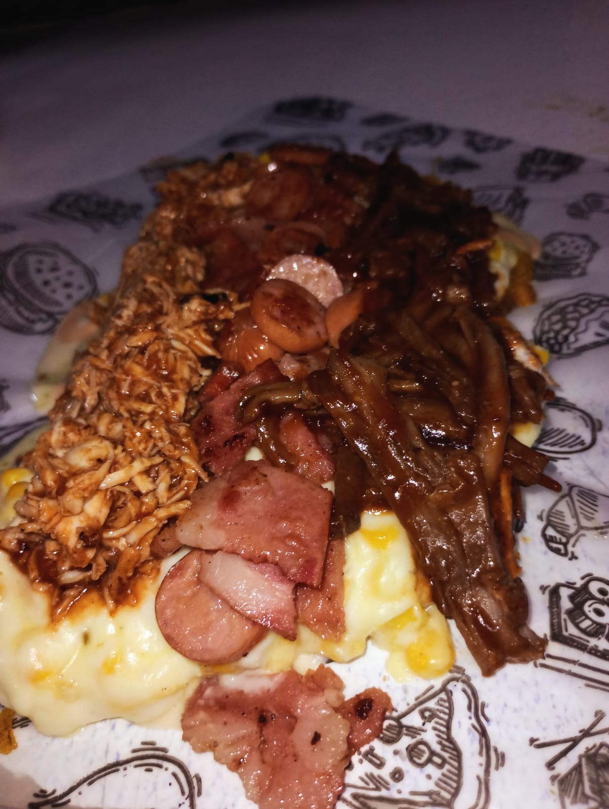 Papa, salchicha ranchera, queso, salsa de la casa, pollo desmechado en salsa bbq, guacamole, pico de gallo, doritos y carne desmechada en salsa bbq.