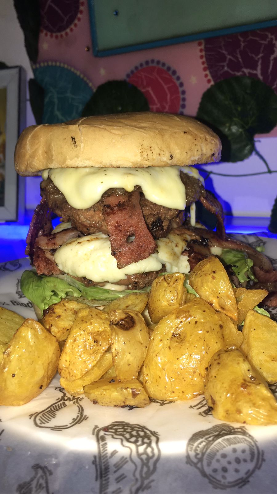 Lechuga, tomate, 3 deliciosas carnes de res, cebolla caramelizada, triple queso, extra tocineta y salsa de la casa.