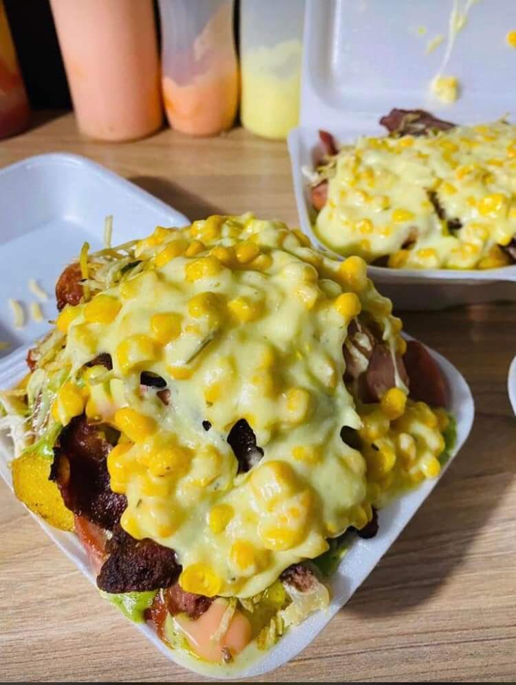 Lechuga, tomate, carne o pollo, cebolla caramelizada, tocineta, queso, aguacate, maiz y salsa de la casa.