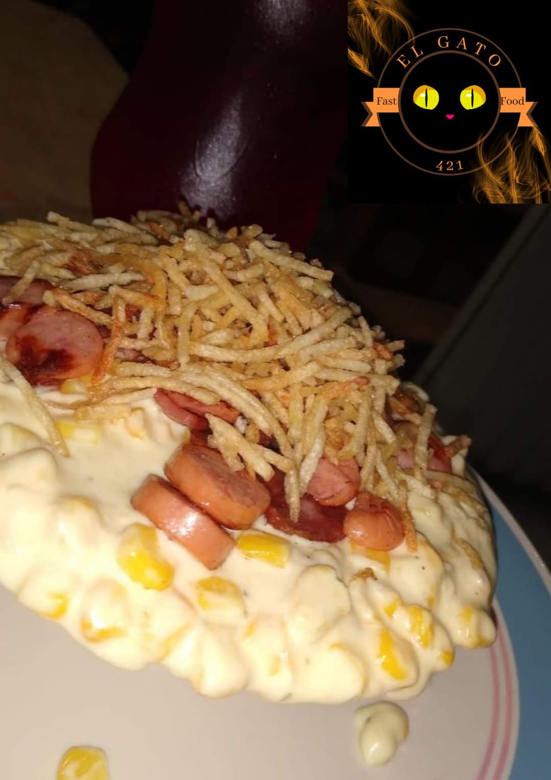 Salchicha, papa amarilla, queso, costilla en salsa bbq y salsa de la casa.