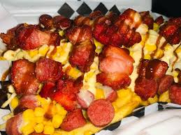 Salchicha ranchera, papa amarilla, queso, costilla en salsa bbq y salsa de la casa.