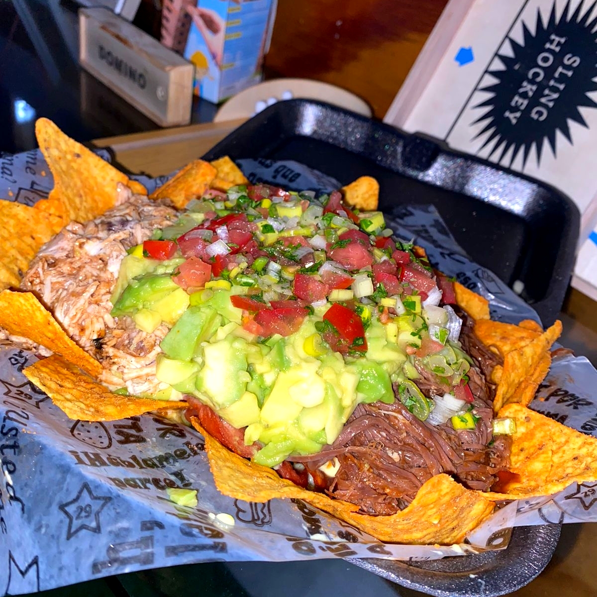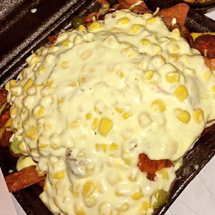 Doritos, salsa de la casa, carne desmechada, pollo desmechado en salsa bbq, tocineta, ranchera, pico e gallo, queso derretido y maiz tierno.