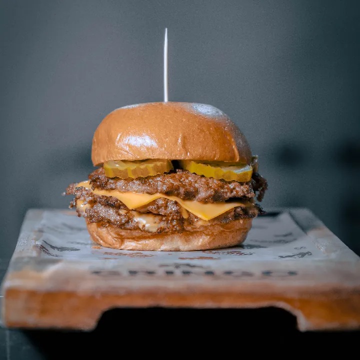Tres Carnes Smash 100% Angus, Doble Queso Americano, Salsa Gringa y Pepinillos.
