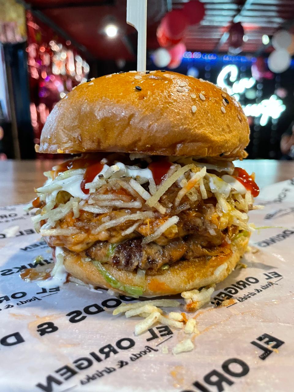 Pan brioche, 150 gr de Carne artesanal, 120 gr de filete de pollo a la plancha, queso mozzarella, cebolla sofrita, doble tocineta ahumada, madurito frito y salsa de ajo de la casa y verduras frescas