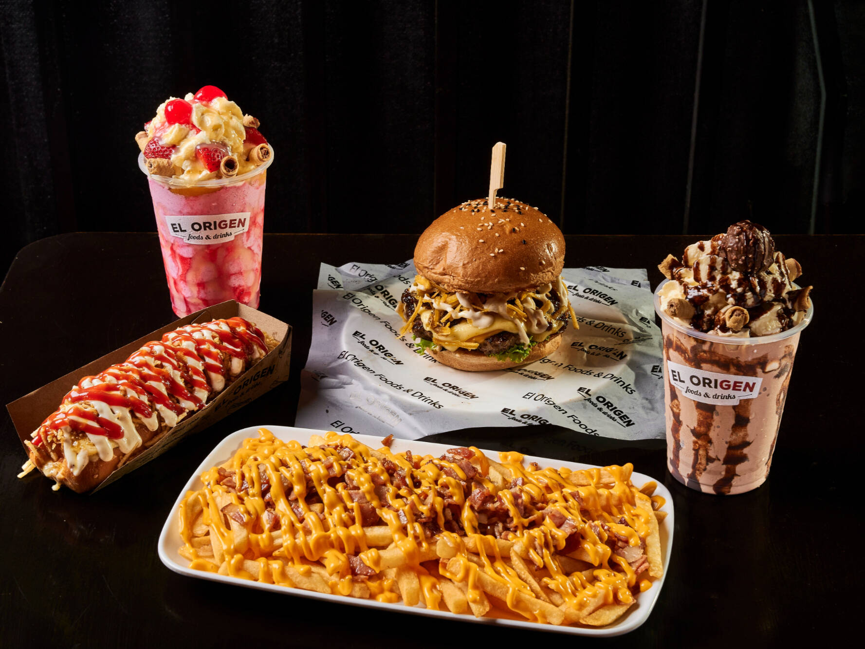 Pan brioche, salchicha premium ahumada, queso mozzarella, aros de cebolla apanados, tocineta en julianas, maduritos fritos y salsas de la casa ajo y chipotle