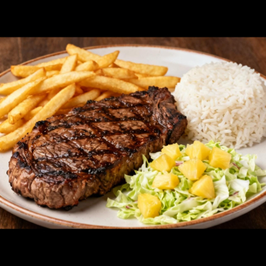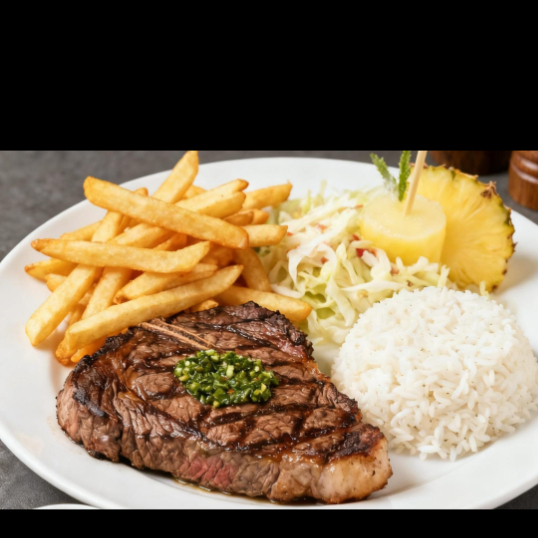 350 gr de punta anca de res,acompañado de arroz blanco, 200 gr de francesa, ensalada de repollo y piña calada, chimichurri