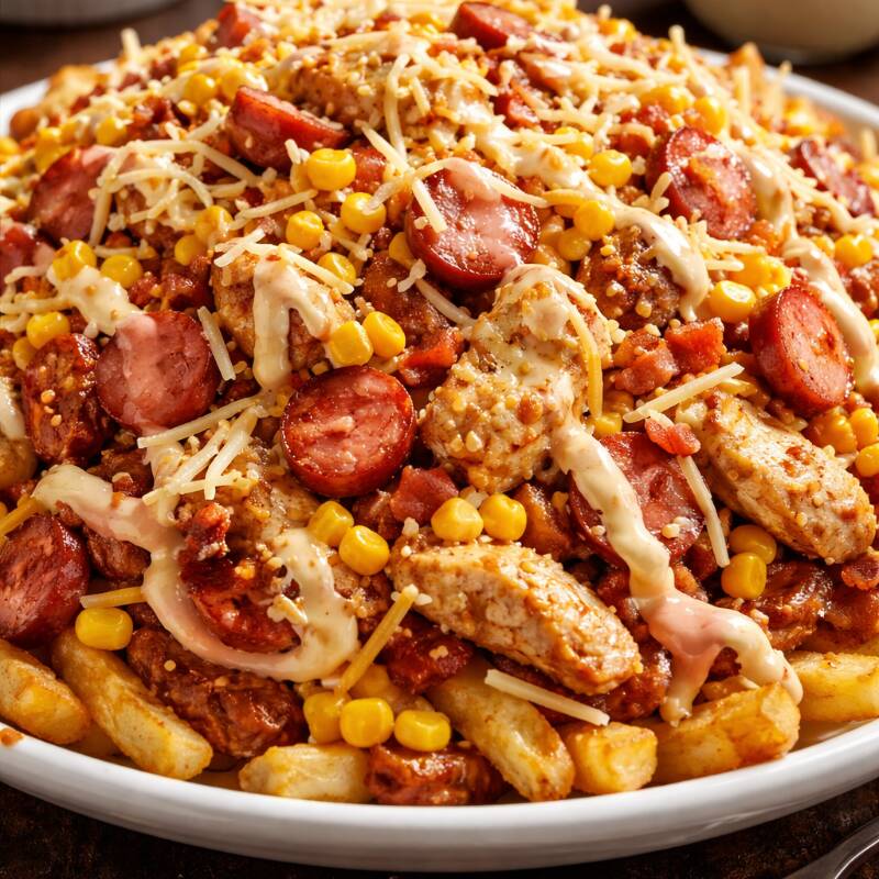 400 gr de papa francesa, 200 gramos salchicha, 100 gr de ripio, 150 gr de tocineta,100 gr maiz 200 gramos de filete pollo, queso,salsas