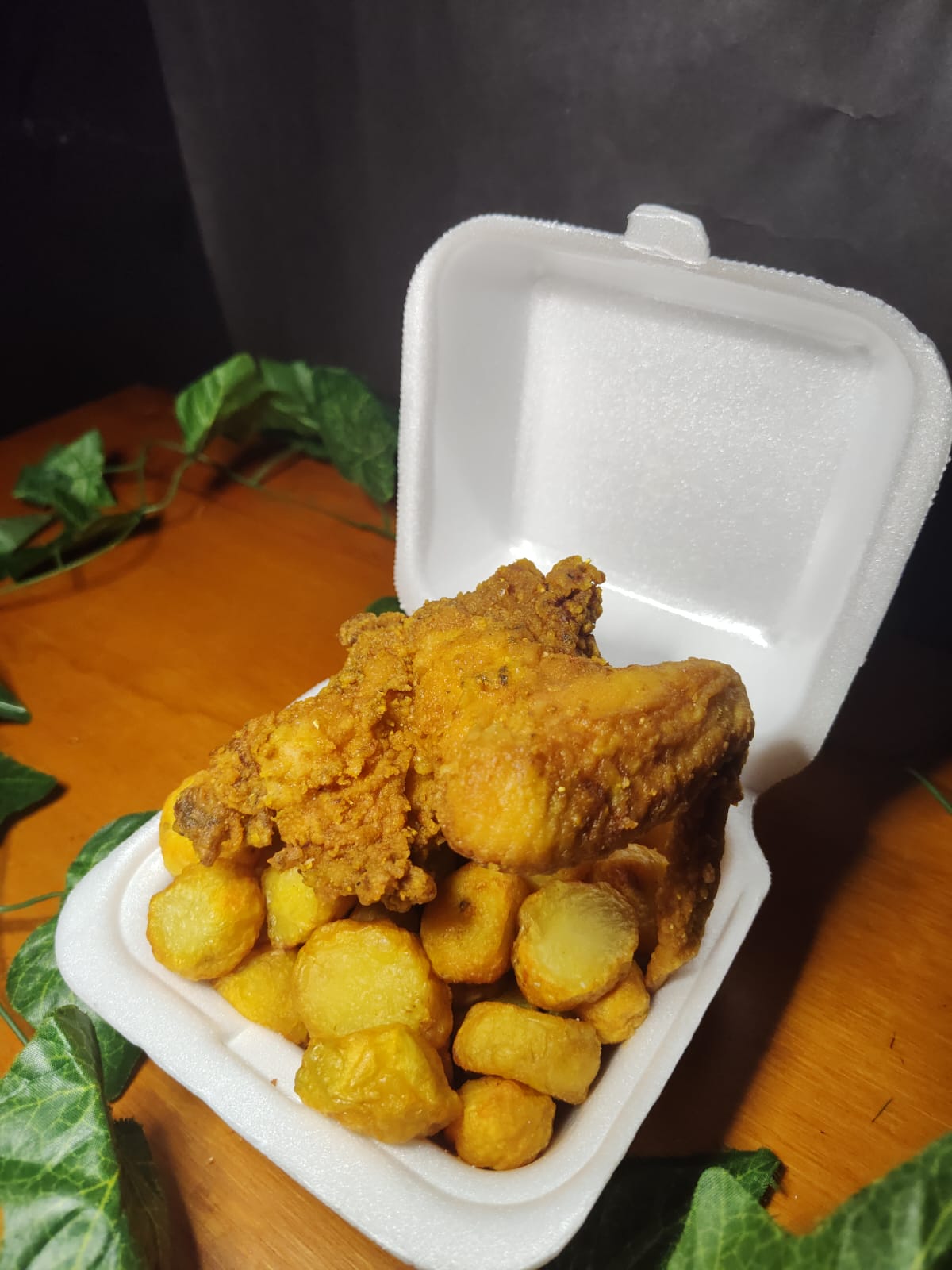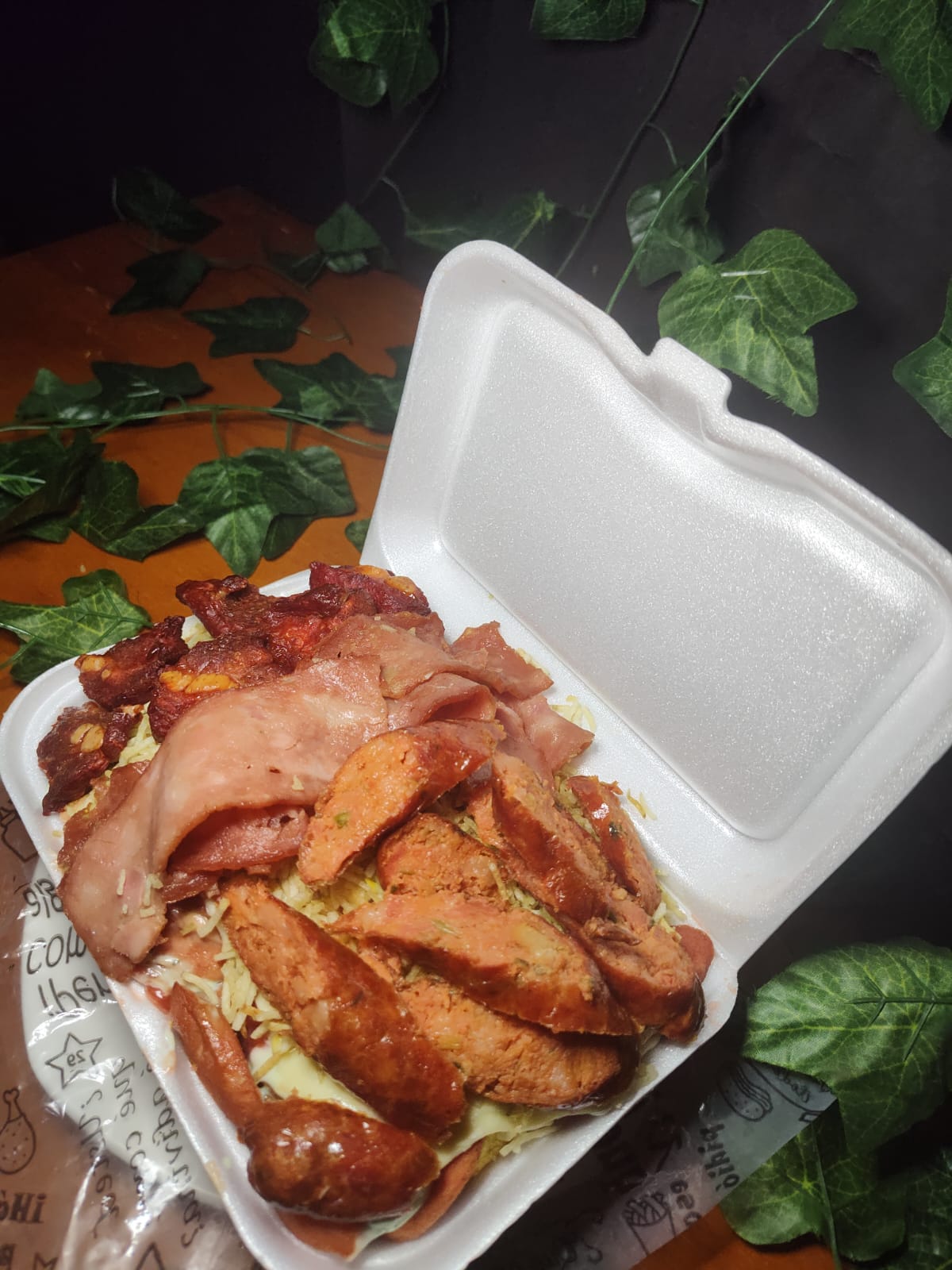 Papa, salchicha, costilla, chorizo, tocineta, ripio, queso y salsa de la casa.
