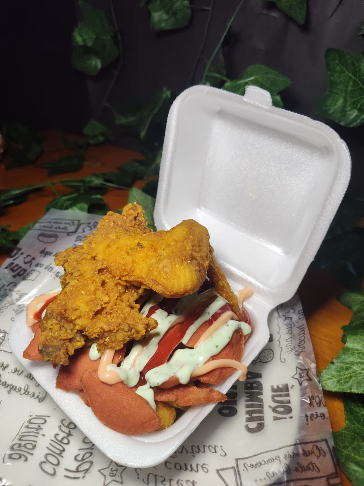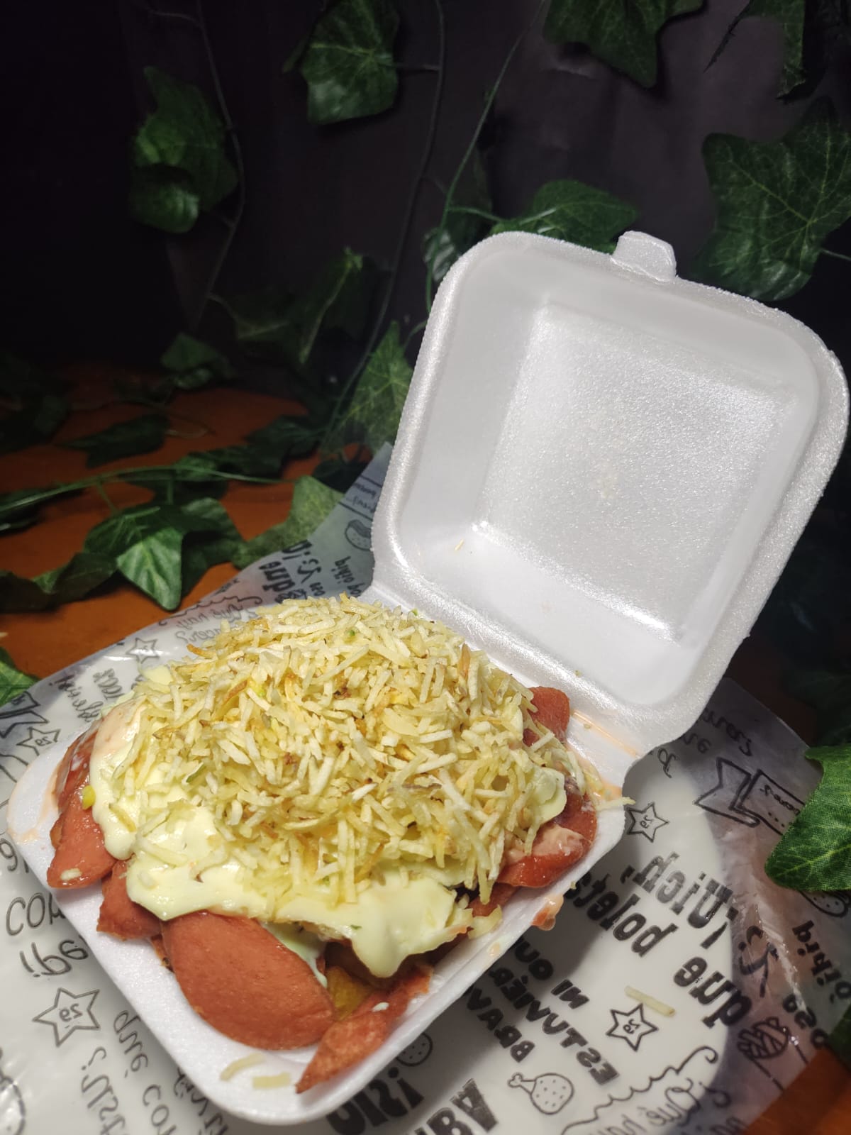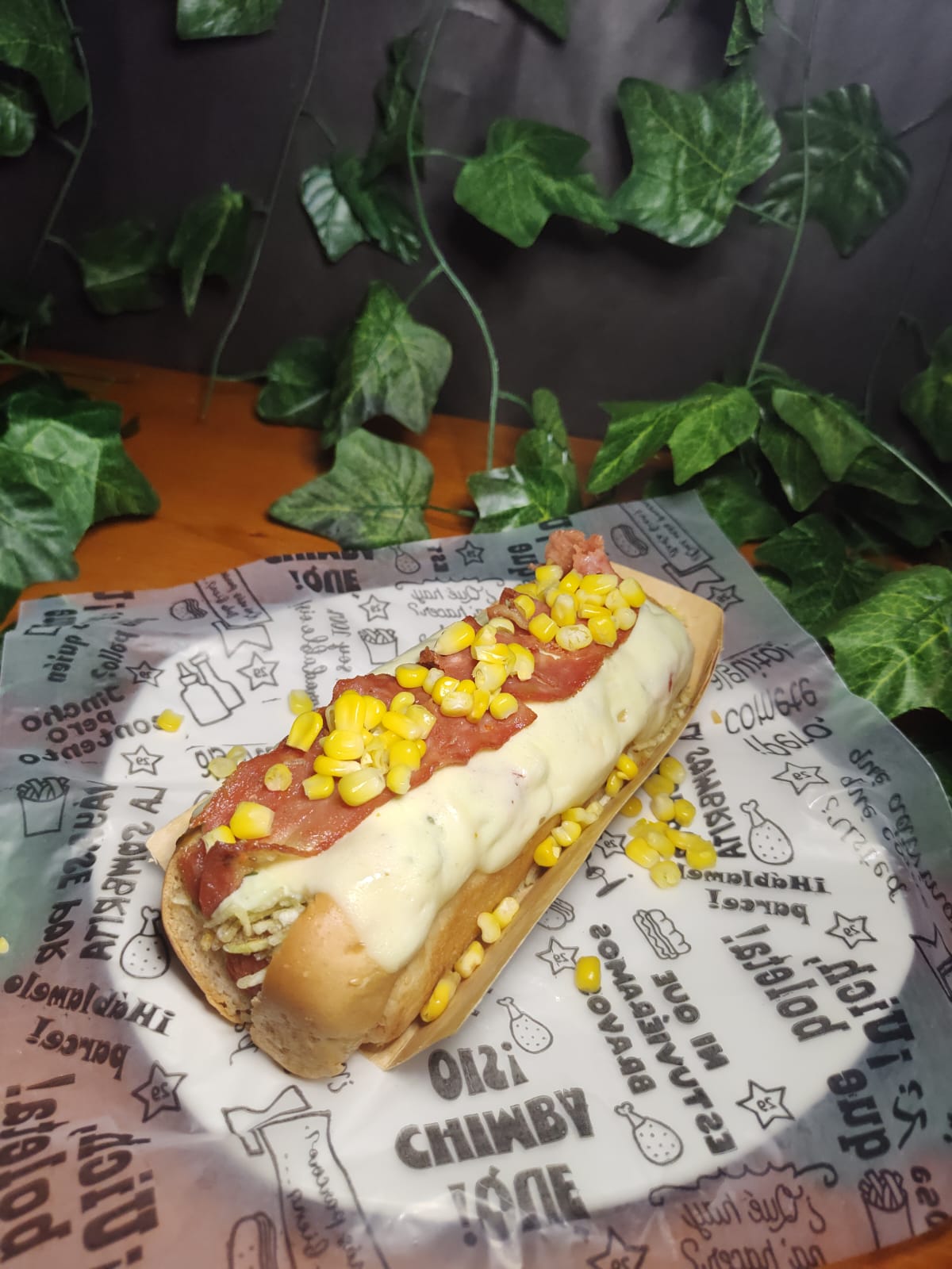 Salchicha, cebolla caramelizada, ripio, queso, tocineta, maíz, aguacate y salsa de la casa.