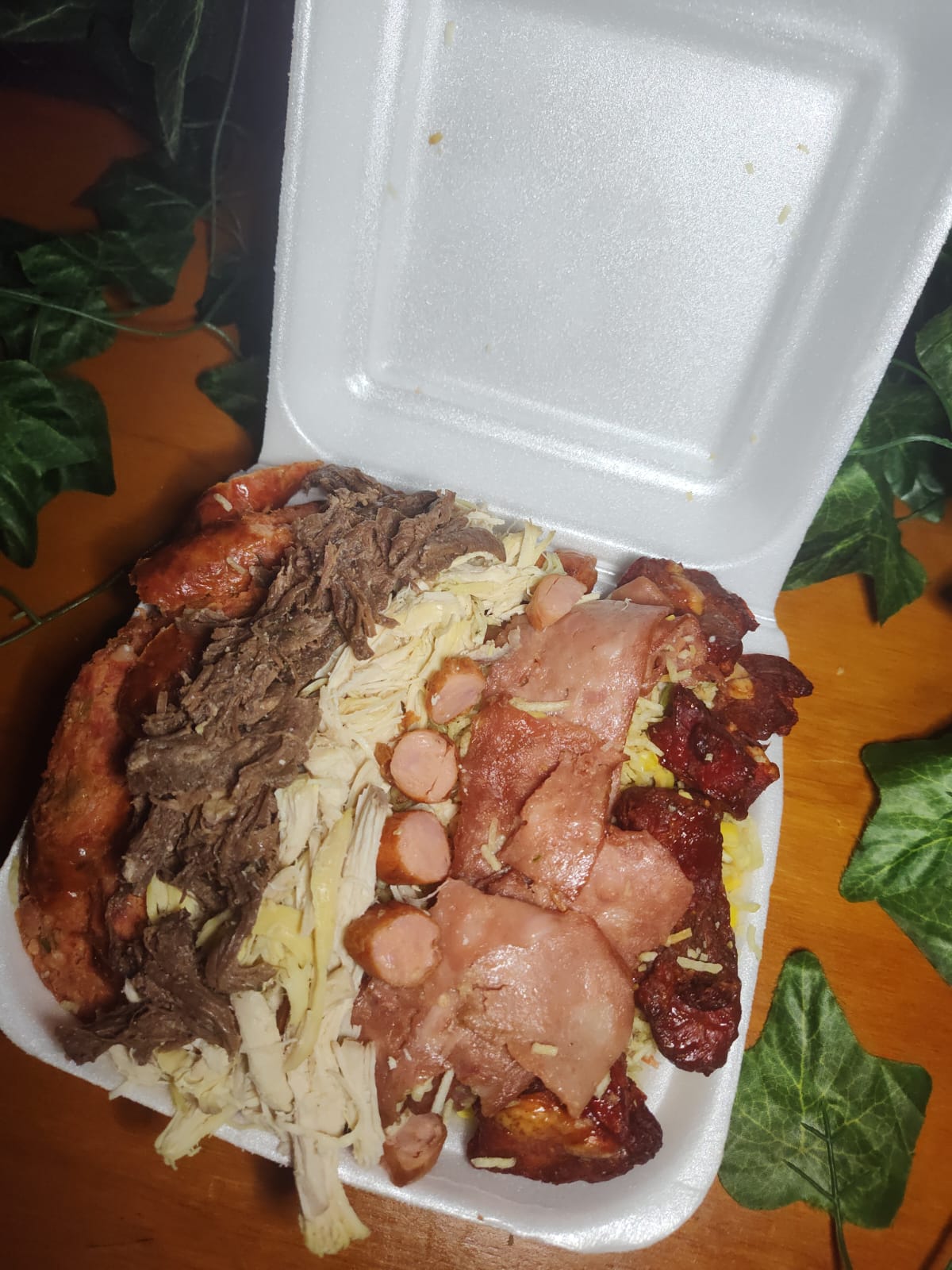 Papa, salchicha, costilla, chorizo, tocineta, ripio, queso, maíz, Rancheras, maduro, pollo, carne desmechada y salsa de la casa.