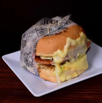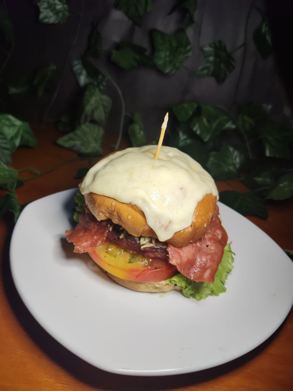 Carne o pollo, tomate, lechuga, ripio, carne, tocineta, queso, cebolla caramelizada y salsa de la casa.