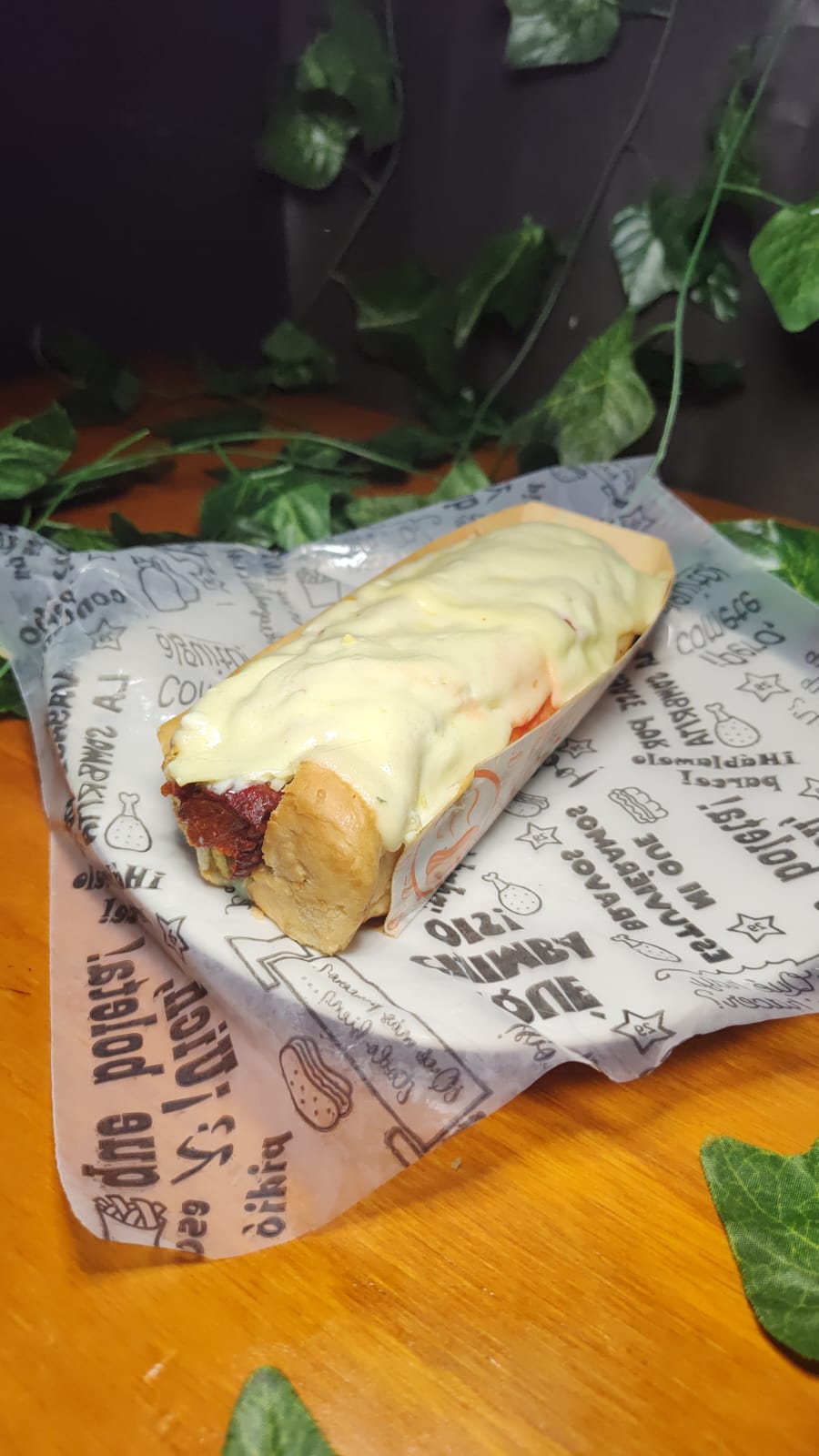 Salchicha, cebolla caramelizada, ripio, queso y salsa de la casa.