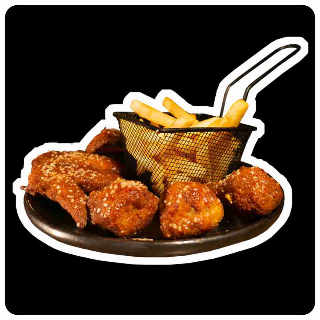 Pollo, carne desmechada, trocitos costilla BBQ, chicharrón y queso.