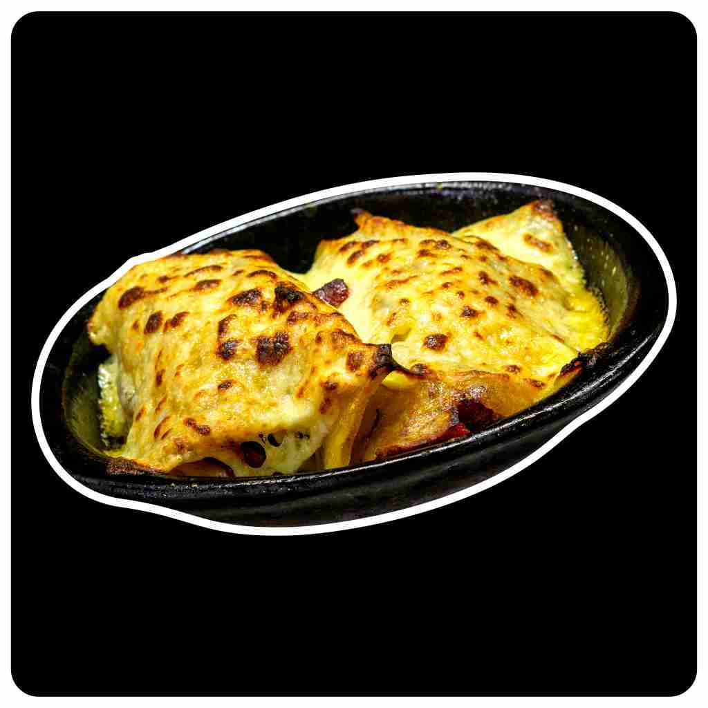 Costilla pulpa, pollo, carne boloñesa, salsa de la casa (poco dulce) y queso.