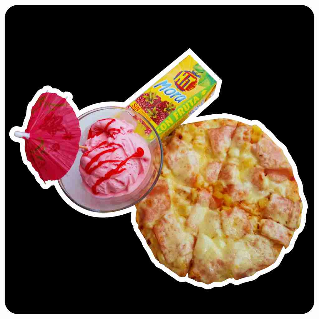 Piña, jamón, pollo, queso, lechuga, salsa de la casa.