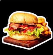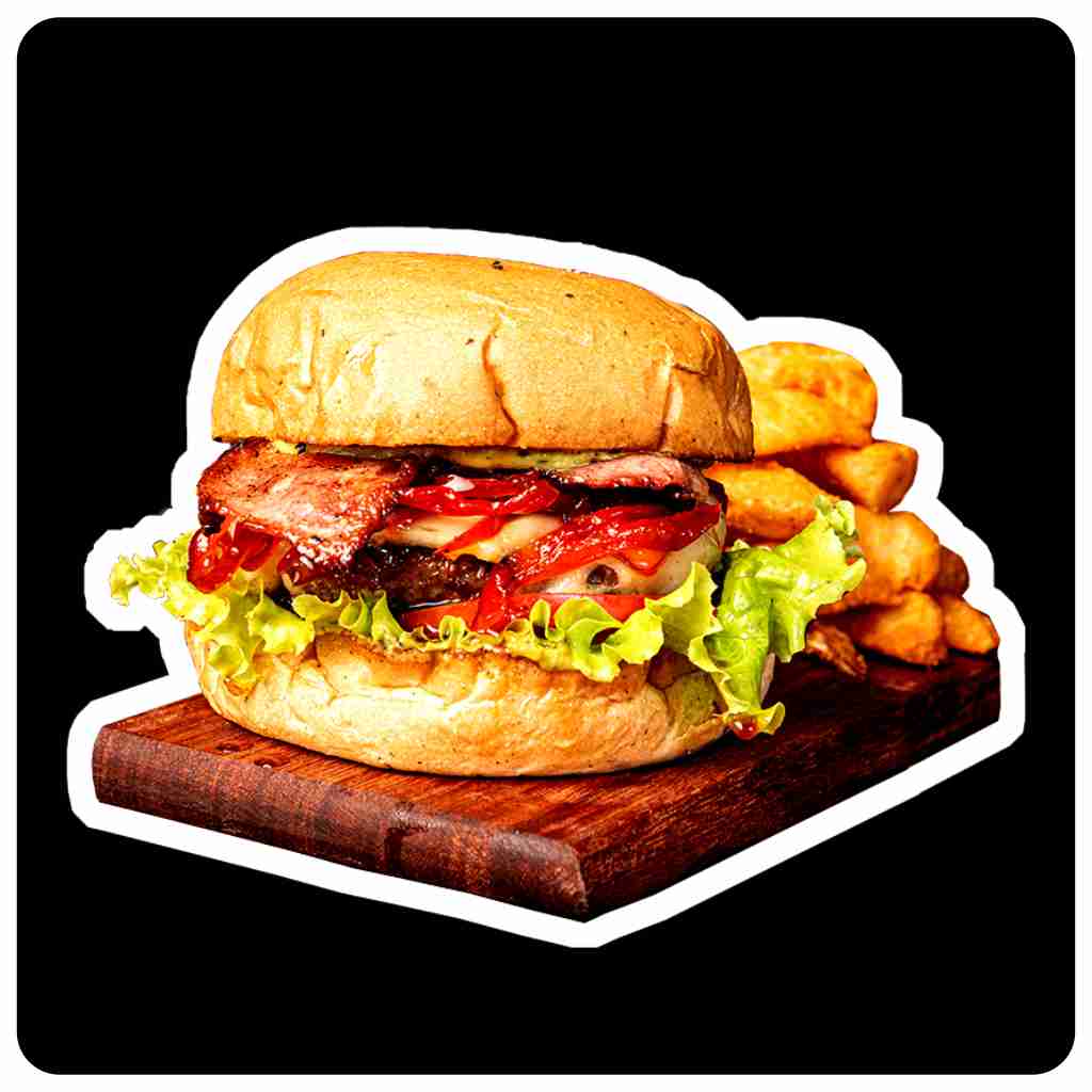 Pan artesanal, carne angus 150 g, queso, cebolla caramelizada, tomate, lechuga, salsas y papa rústica.