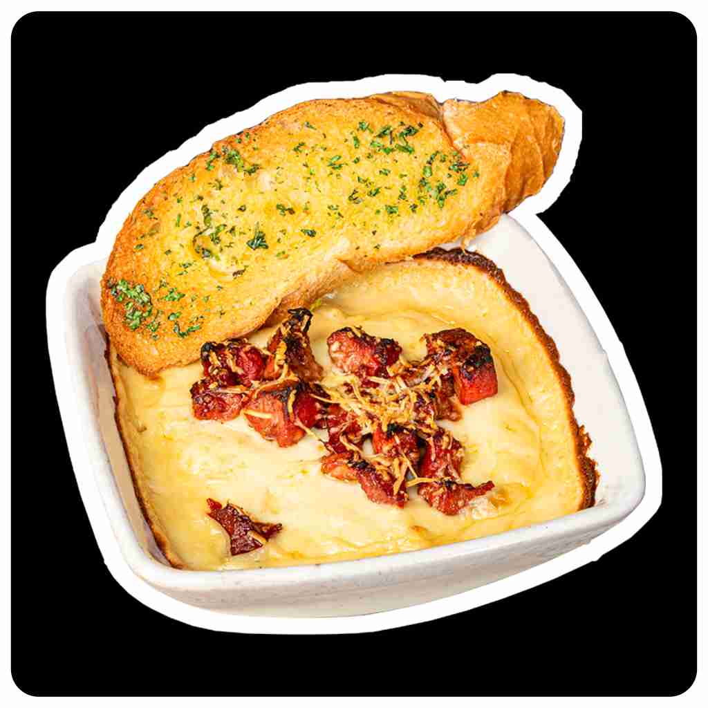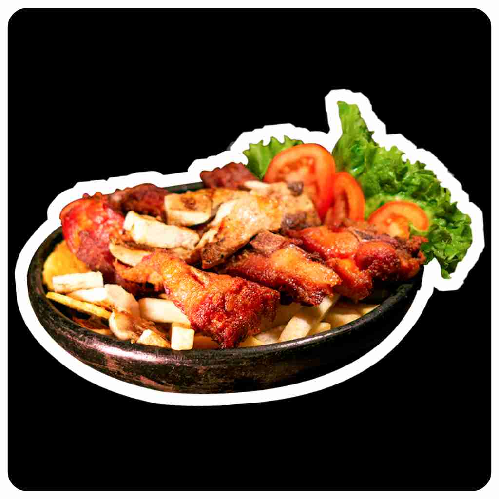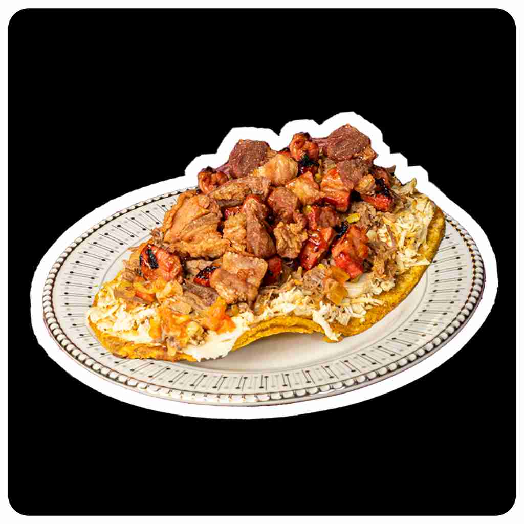 Pollo, carne desmechada, trocitos costilla BBQ, chicharrón y queso.