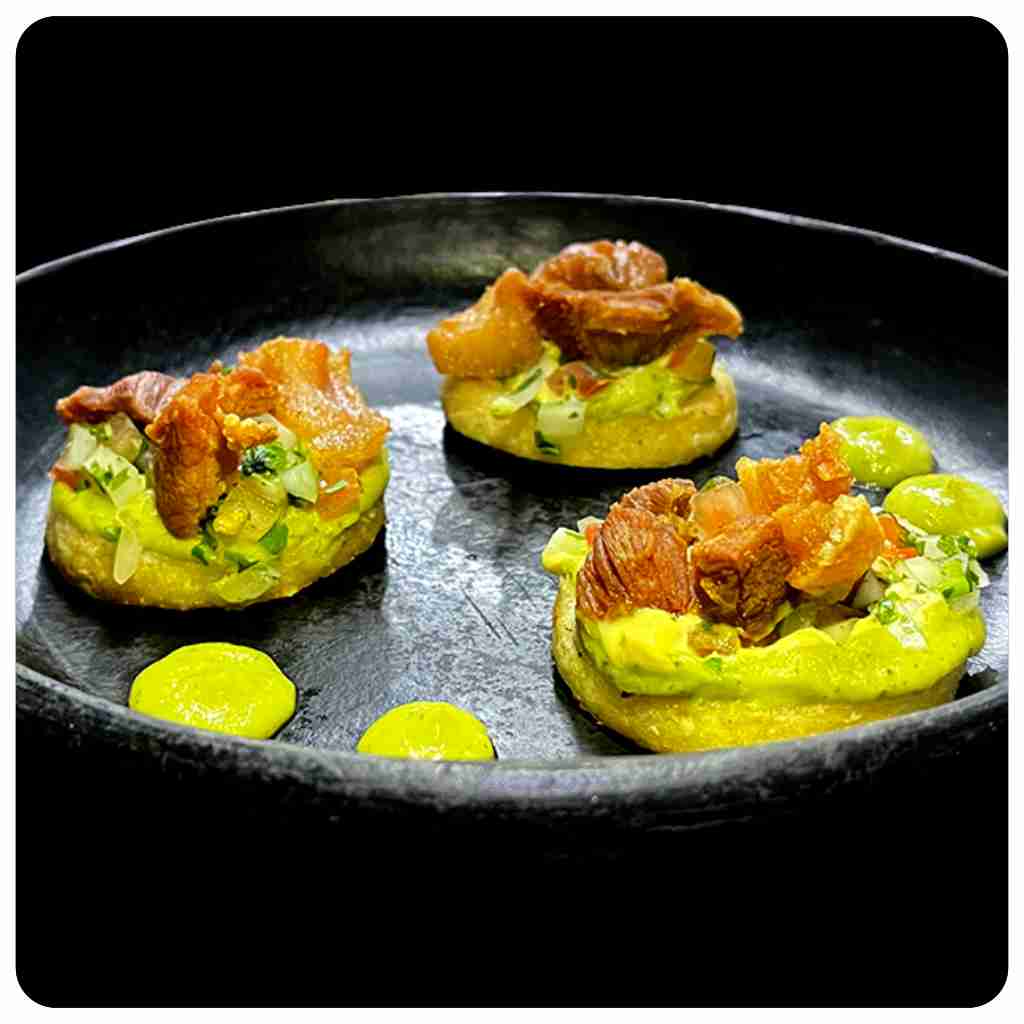 4 Arepas fritas con salsa de la casa, chicharrón y pico de gallo.