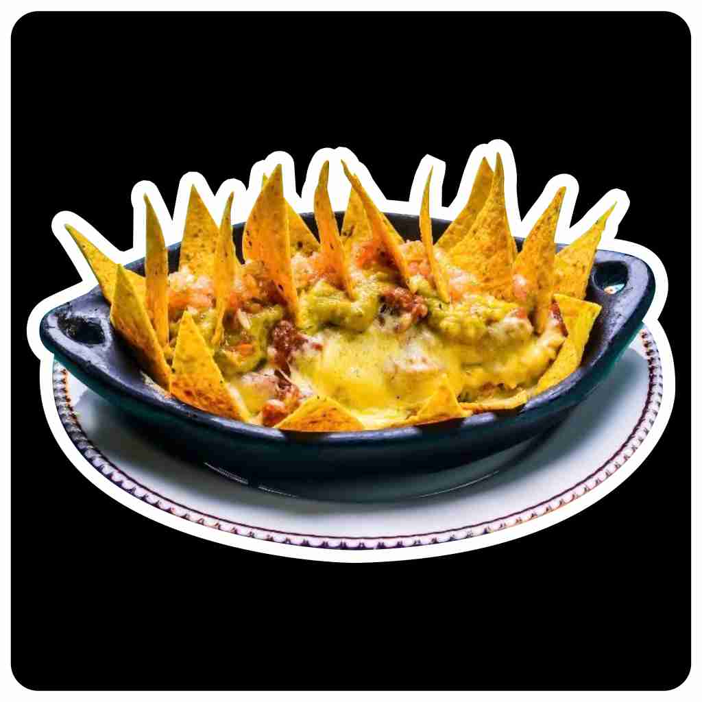 Nachos, pollo, carne boloñesa, trocitos costilla BBQ, pico de gallo, guacamole y queso.